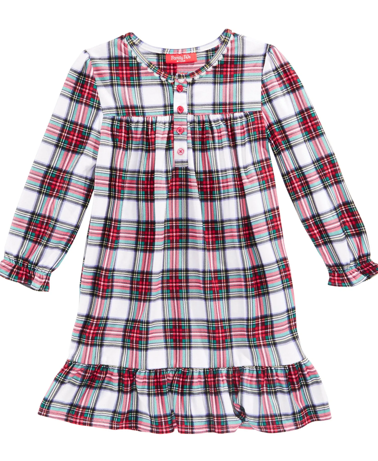 Sweet and cozy in classic plaid, this pullover nightgown from Family Pajamas features a lace-trimmed neckline and ruffled details.