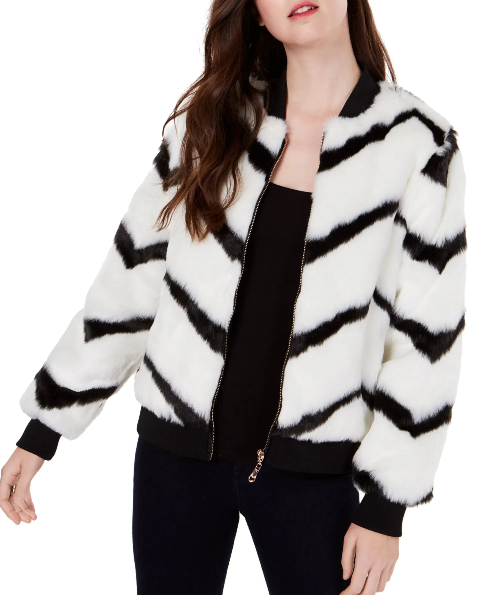 Say What? gives the classic bomber jacket a current look with chevron-printed faux fur, keeping the traditional rib-knit trim and front zipper.