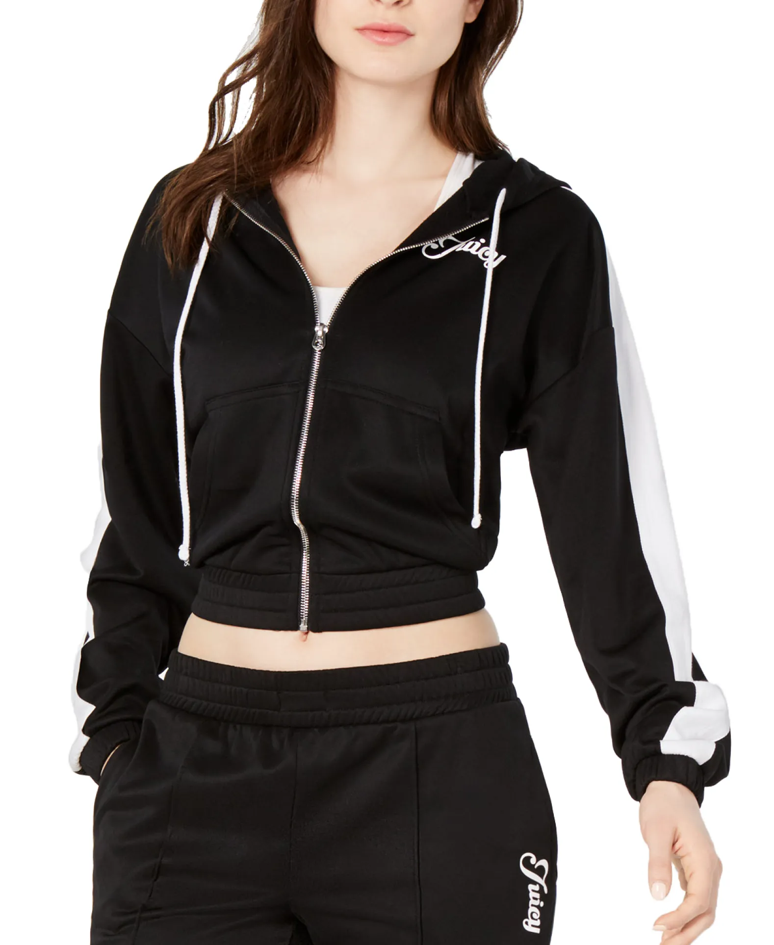 Meet your newest obsession: this sporty jacket from Juicy Couture. Designed with a drawstring hood, cute kangaroo pockets and a fresh, cropped silhouette.
