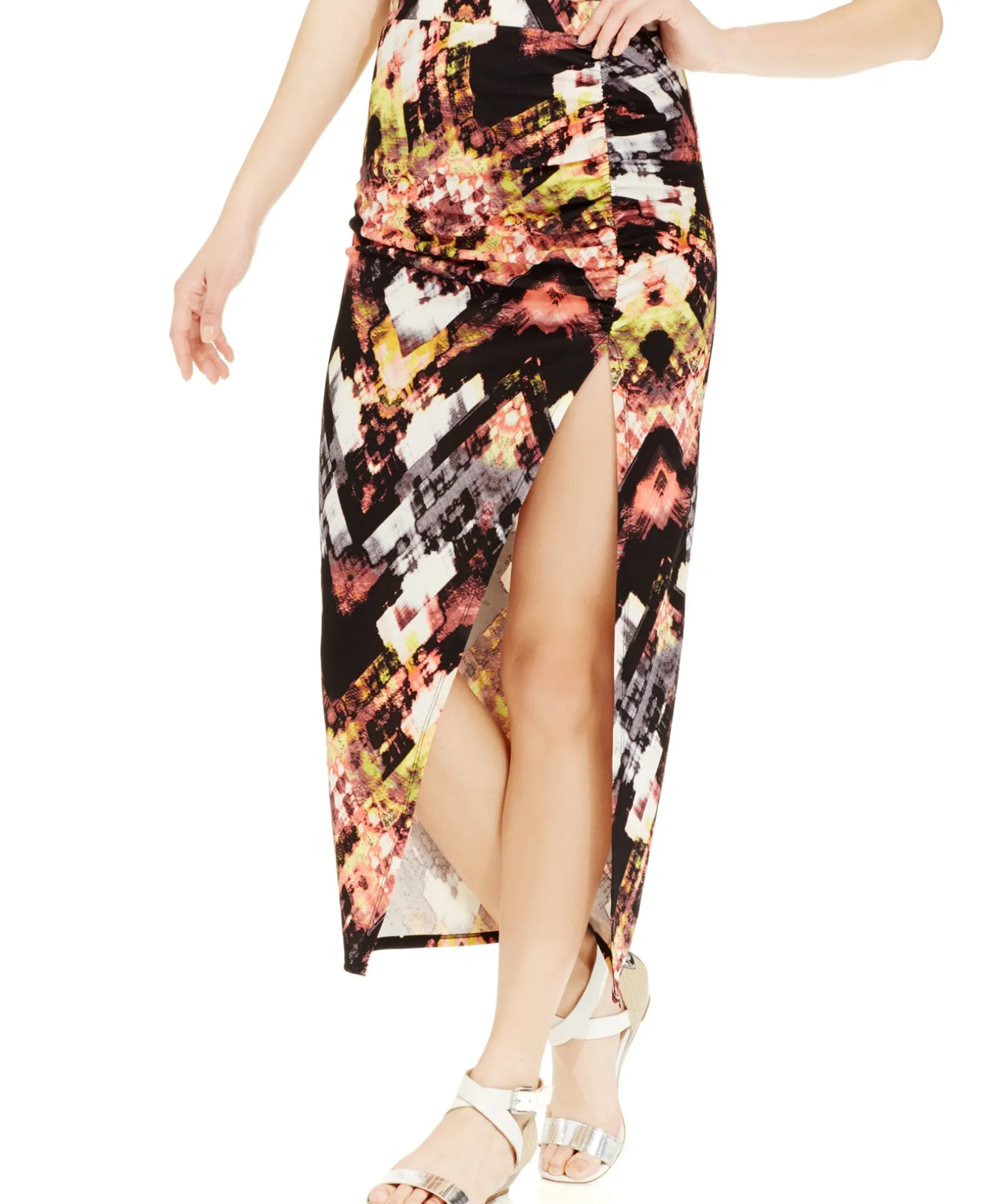 A dramatic slit rides high up the leg and is highlighted by a ruched seam on this chic maxi skirt from Material Girl Juniors’ skirt.