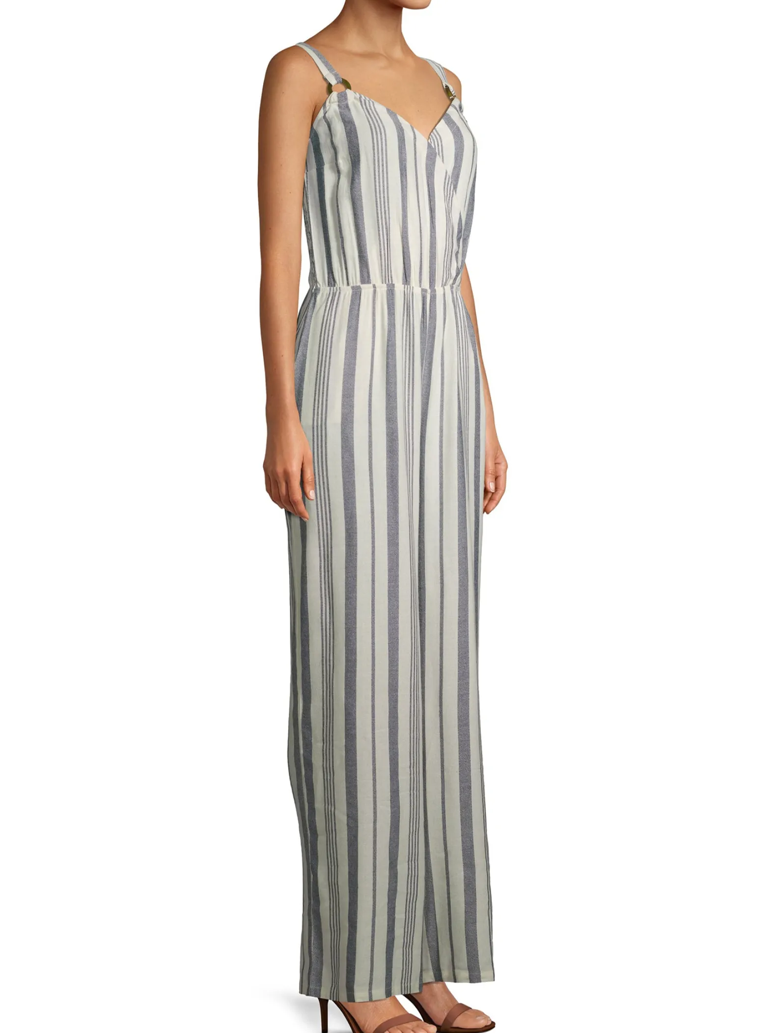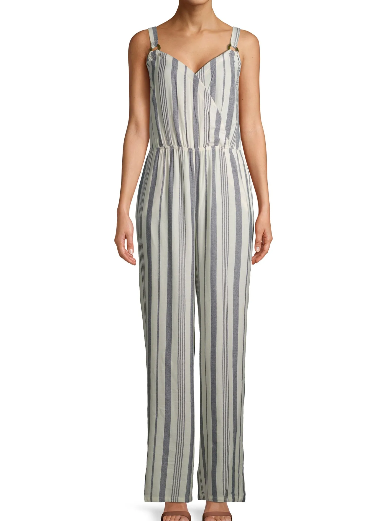 - Tank straps with O-ring; elasticized waist; wide-leg silhouette