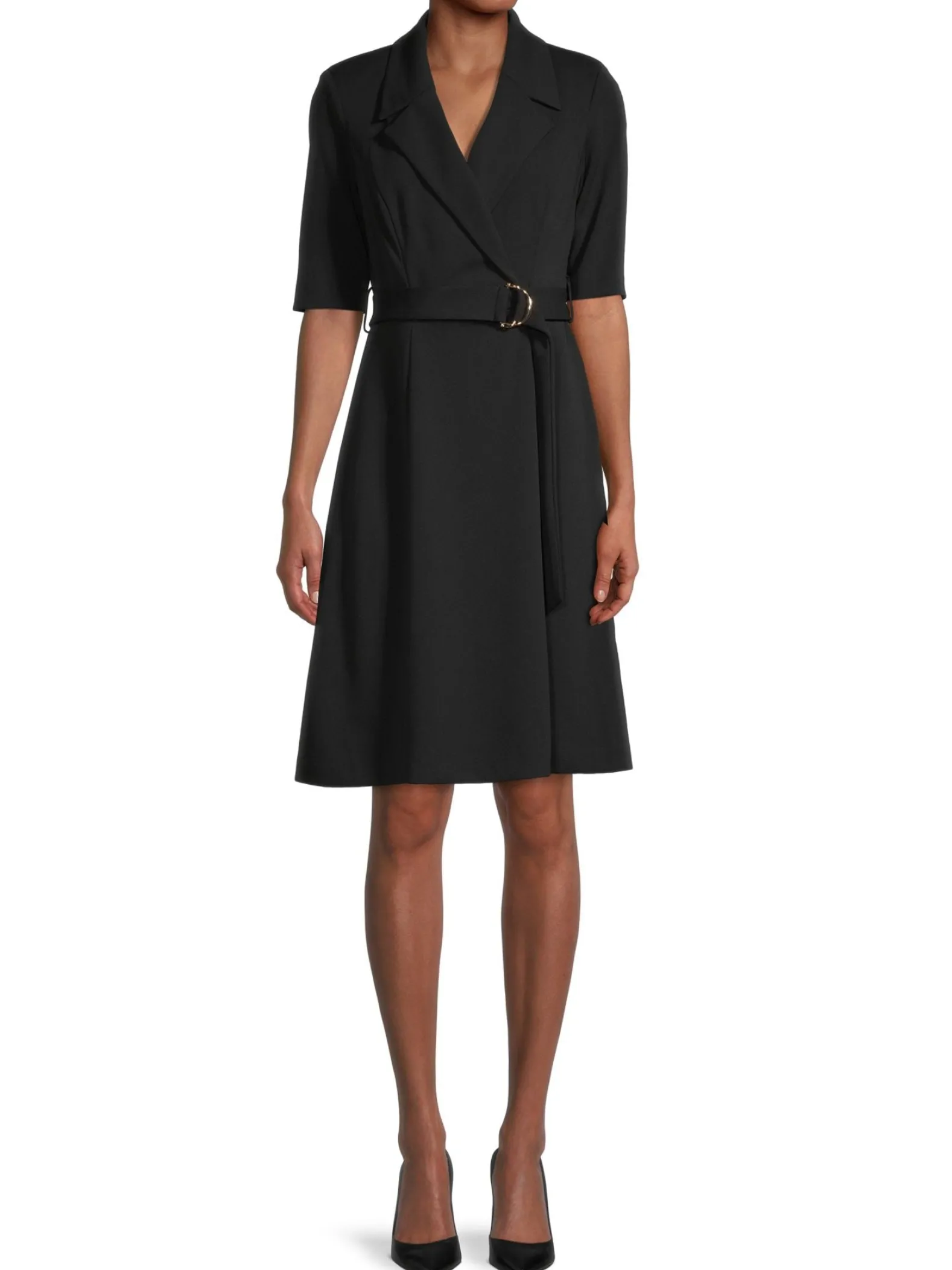 Elegant, workwear dress designed with wrap-style bodice and a belted waist.