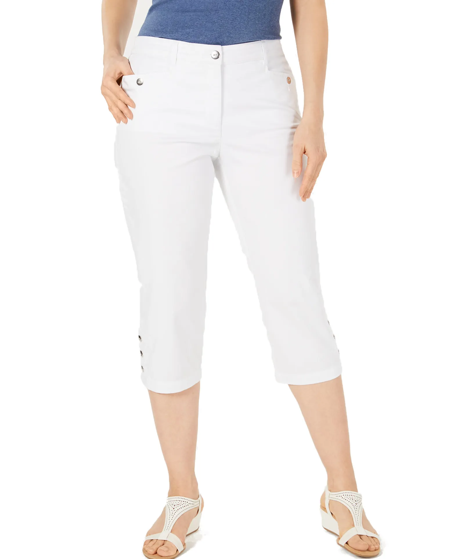 Cool and casually cropped, these mid-rise capri pants from Karen Scott are stylishly finished with classic button details.