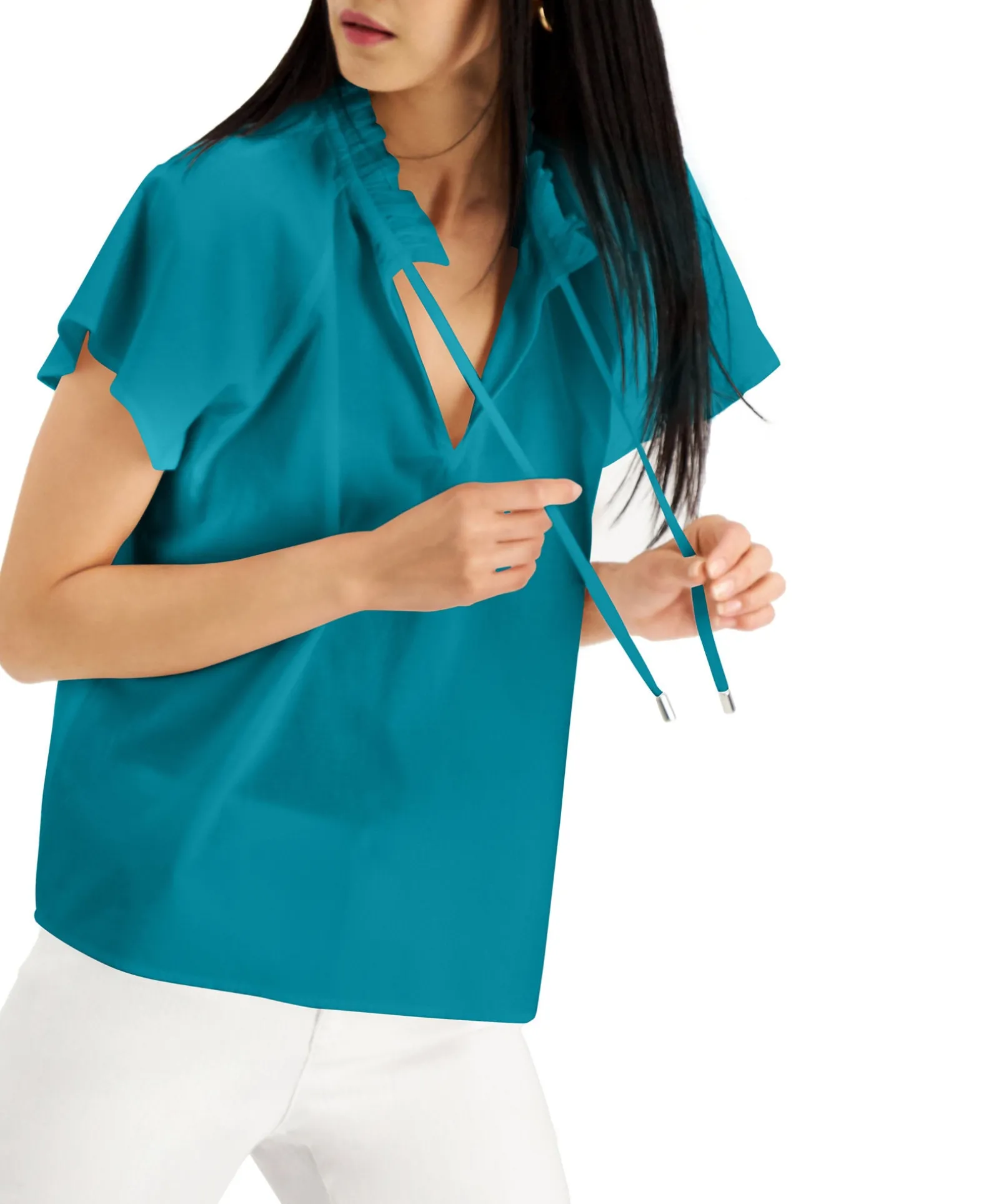 Crafted With Flowy Flutter Sleeves, This INC International Concepts® Cotton Blouse Features A Tie At The Neckline For Added Stylish Versatility.