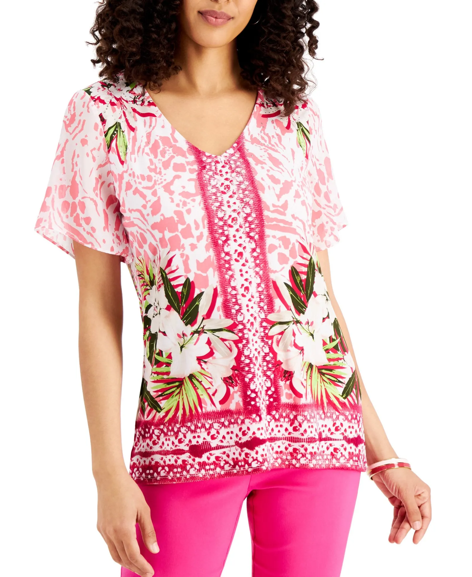 JM Collection Brings A Touch Of Vibrant Charm To Your Wardrobe With This Beautifully Printed V-Neck Top Finished With Delicate Embellished Accents For A Subtle Pop Of Shine.