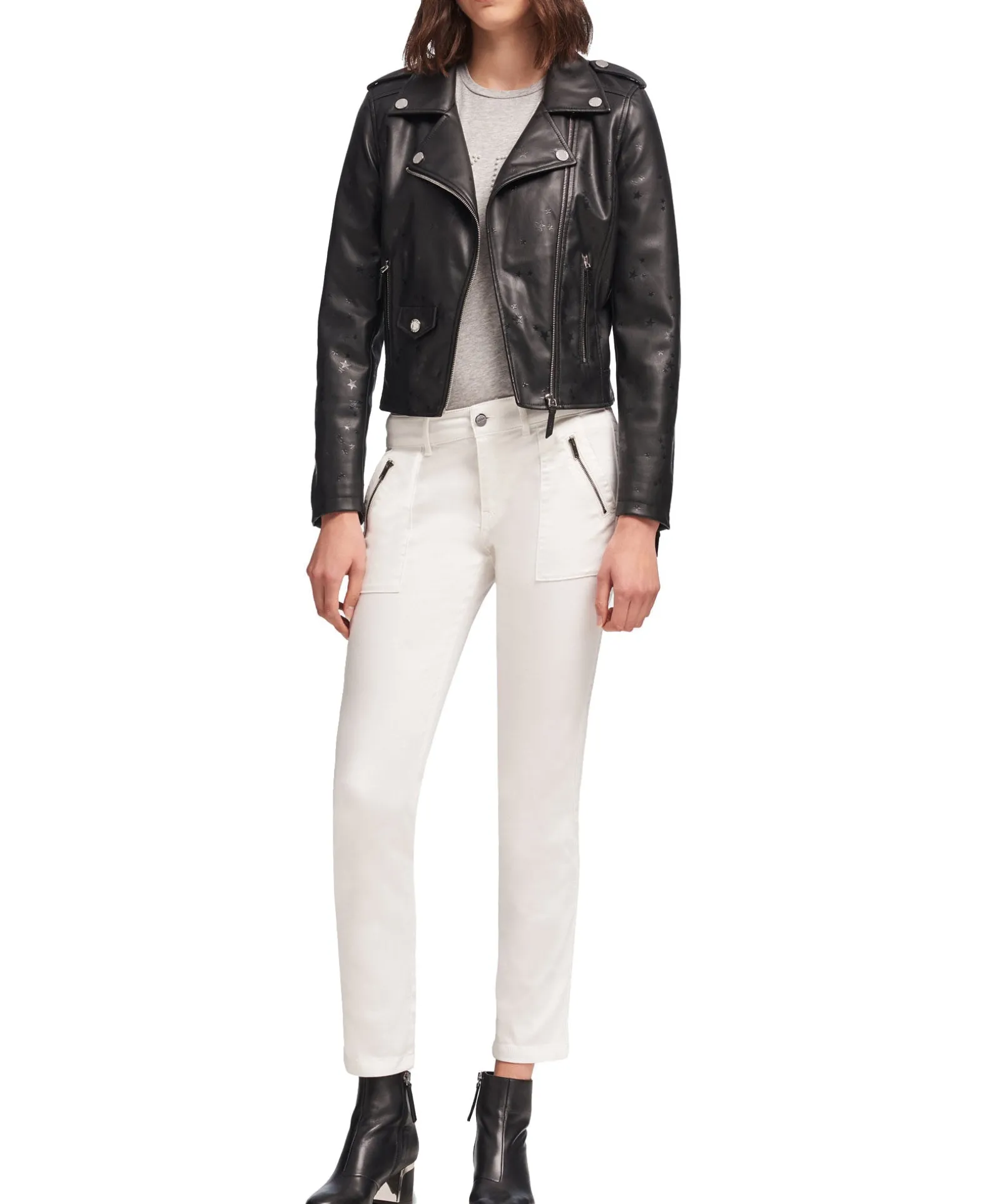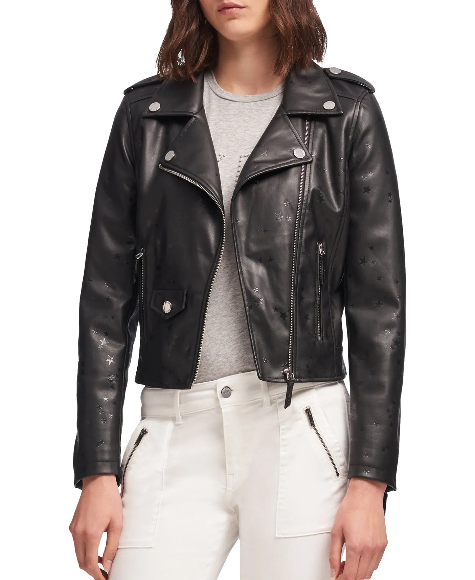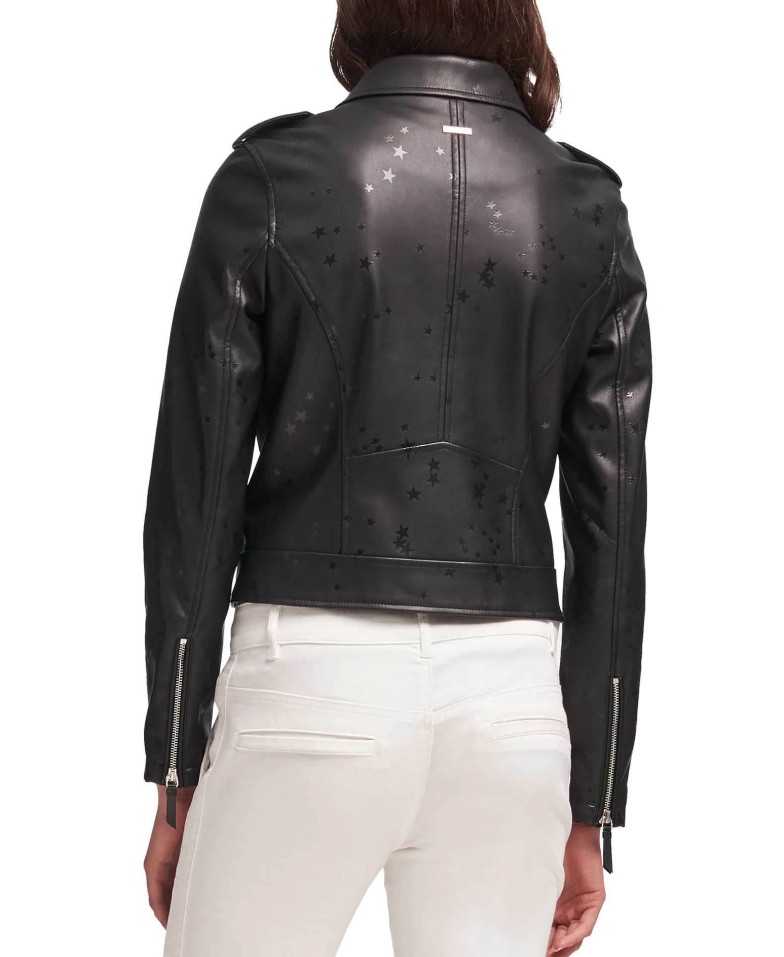 take layering to an edgier place with this moto jacket by dkny, finished with a subtle star print and zipper accents.