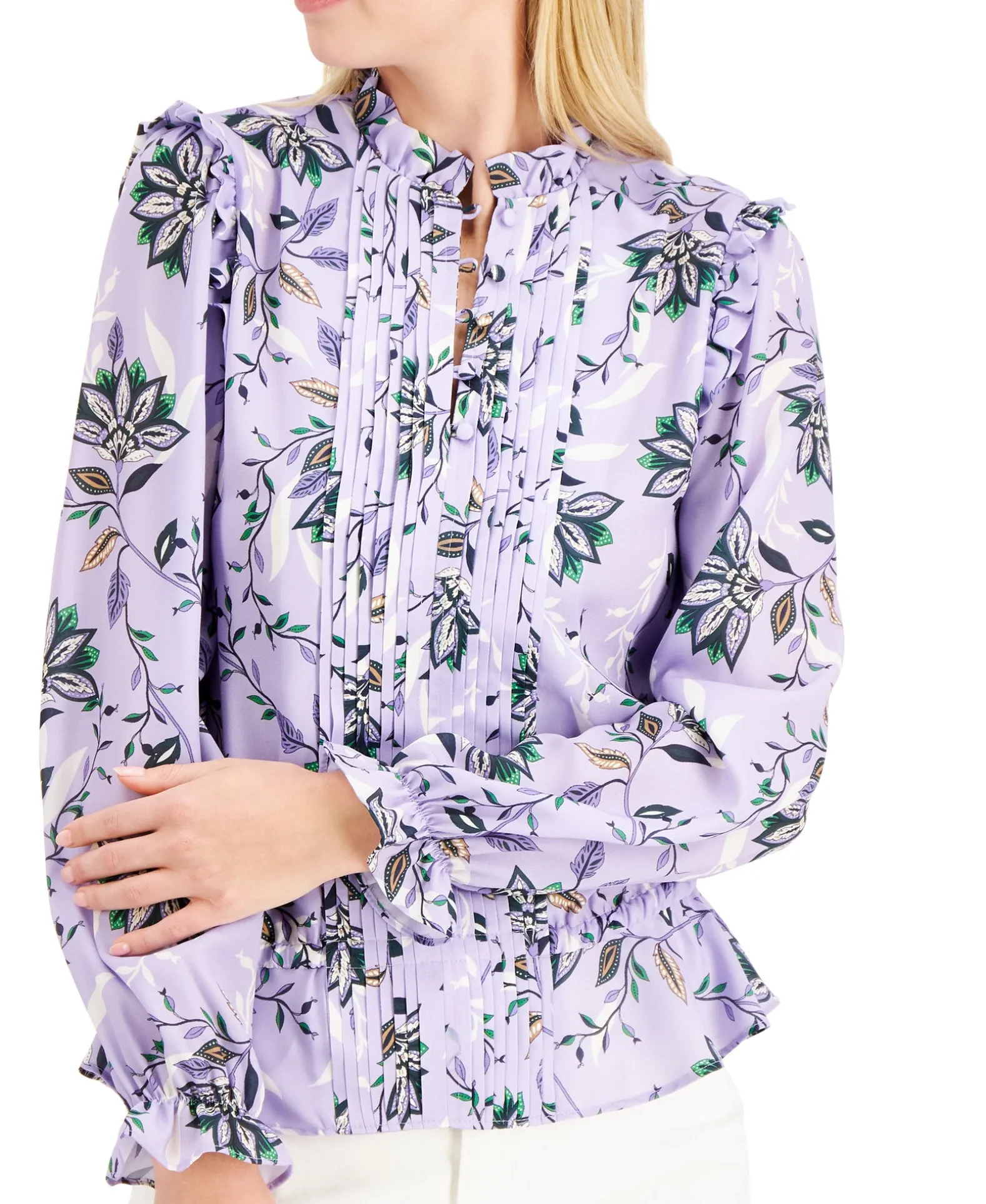 - Pintucked at placket; ruffle trim; floral print