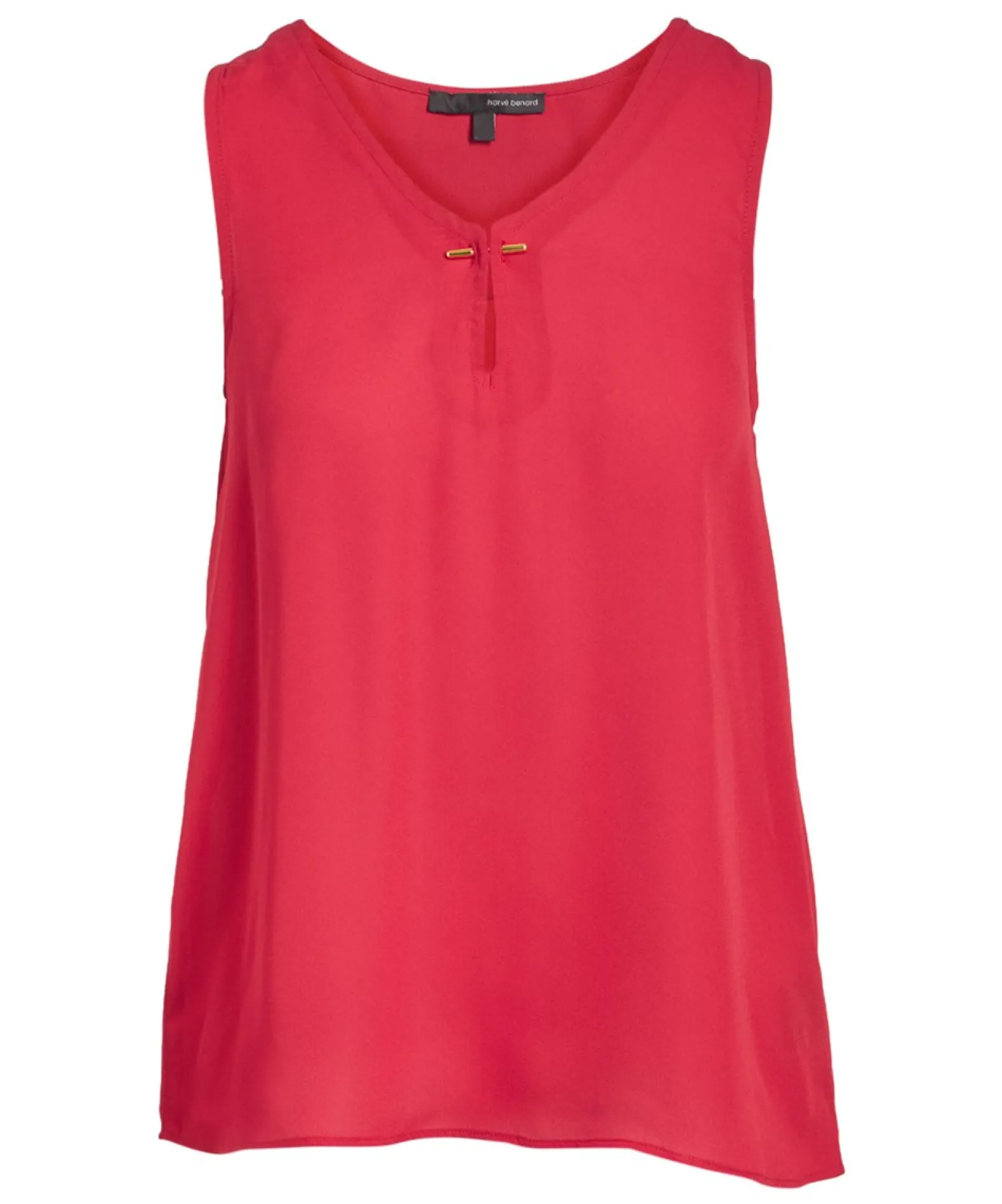 A simple woven tank is elevated with a trendy split neckline that is held in place by a gold-tone metal bar that makes it perfect to wear for a night out.