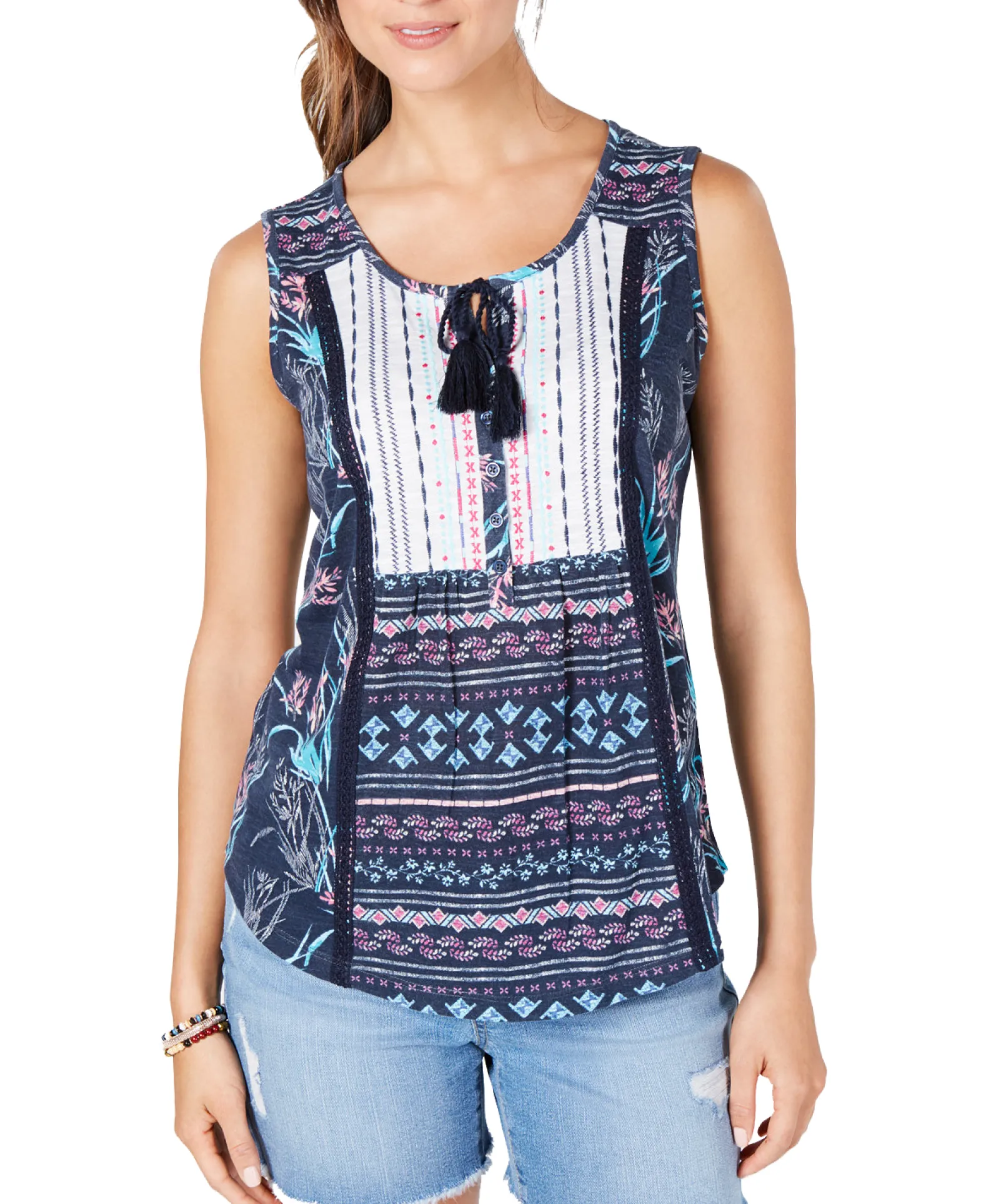 This tassel-tied top from Style & Co has all the boho charm with its complementary patched prints and soft feel.