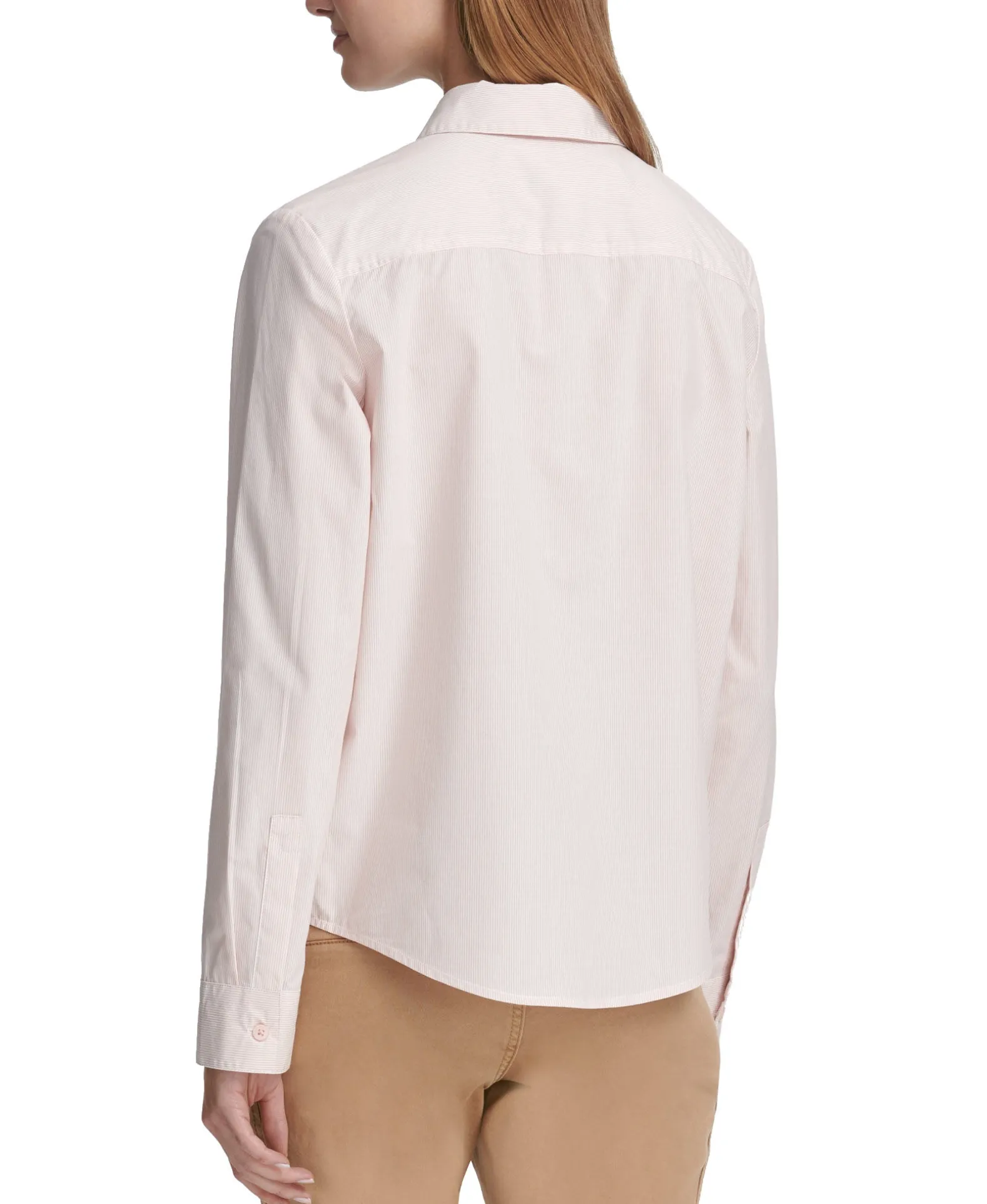 crisp in boldly-striped stretch cotton, dkny’s classic button-up is reworked with a mixed-media finish and contrasting chest pocket.