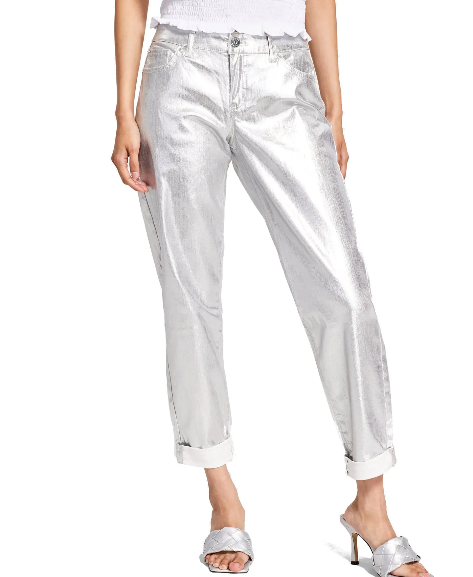 INC International Concepts® Revamps Your Denim Style With These Boyfriend Jeans In A Sparkling Metallic Finish.