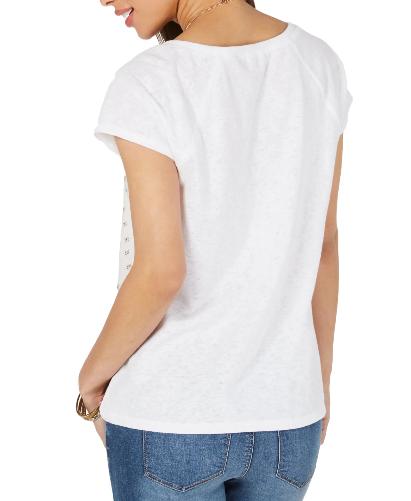 Mixed prints at the front add a modern vibe to this darling top from Style & Co, finished with a flattering scoop-neckline and cap-sleeves.