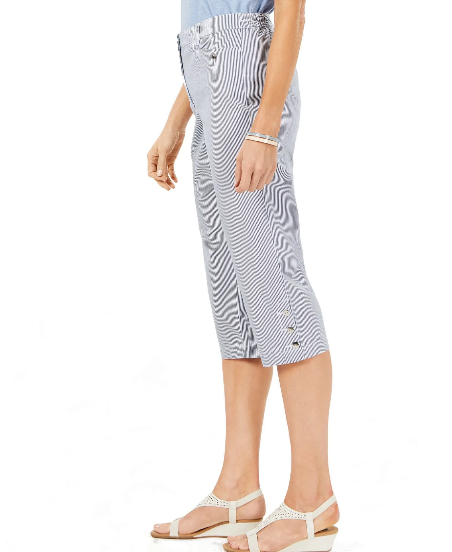 Add Dimension To Your Wardrobe With Karen Scott’s Striped Linen Capri Pants. The Triple-Button Hem Closes Out These Pants In Style.