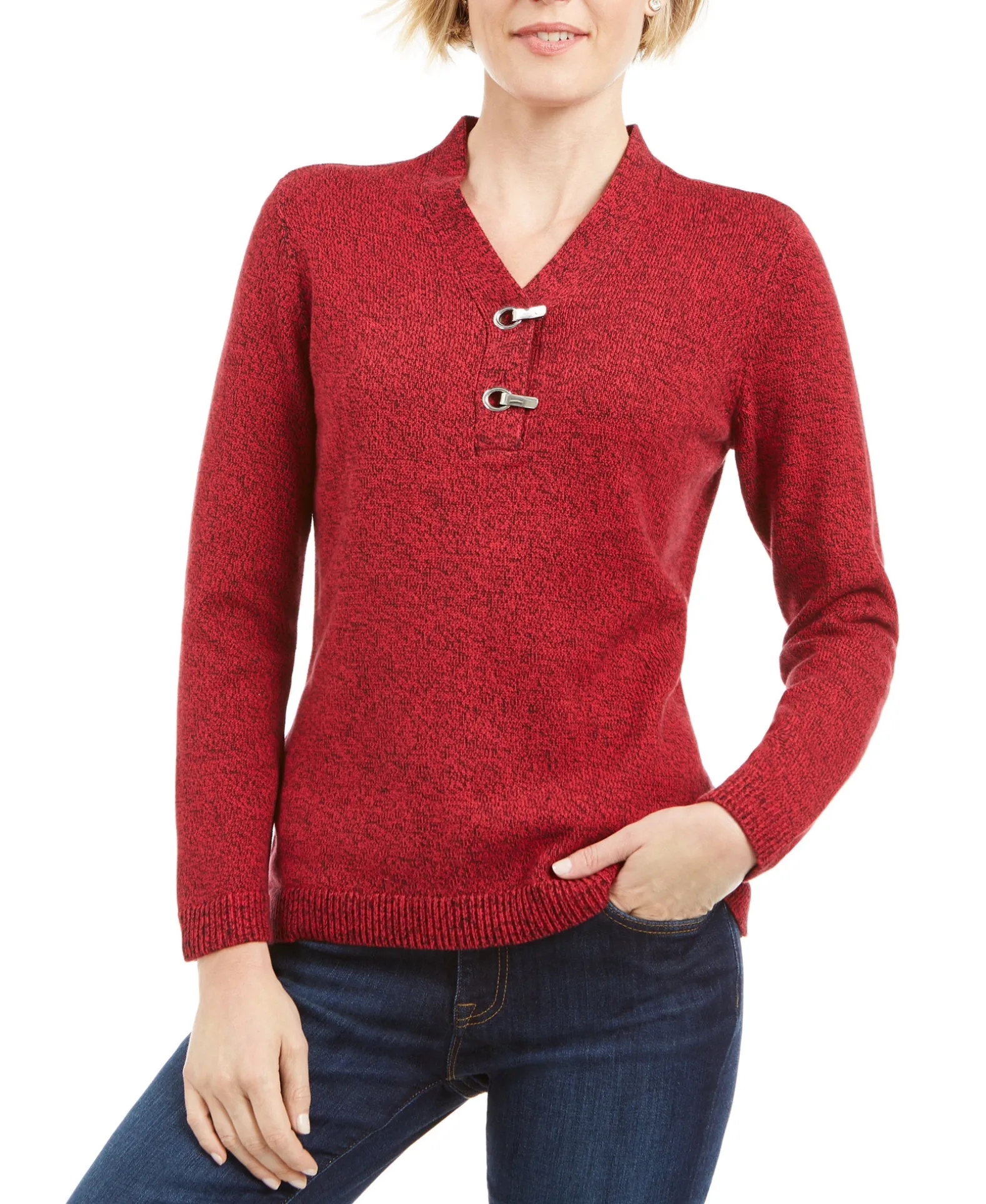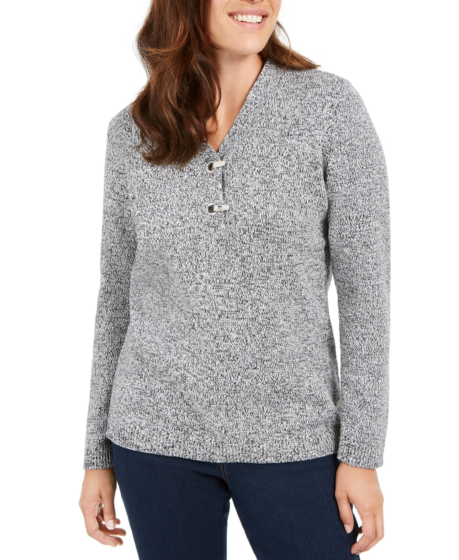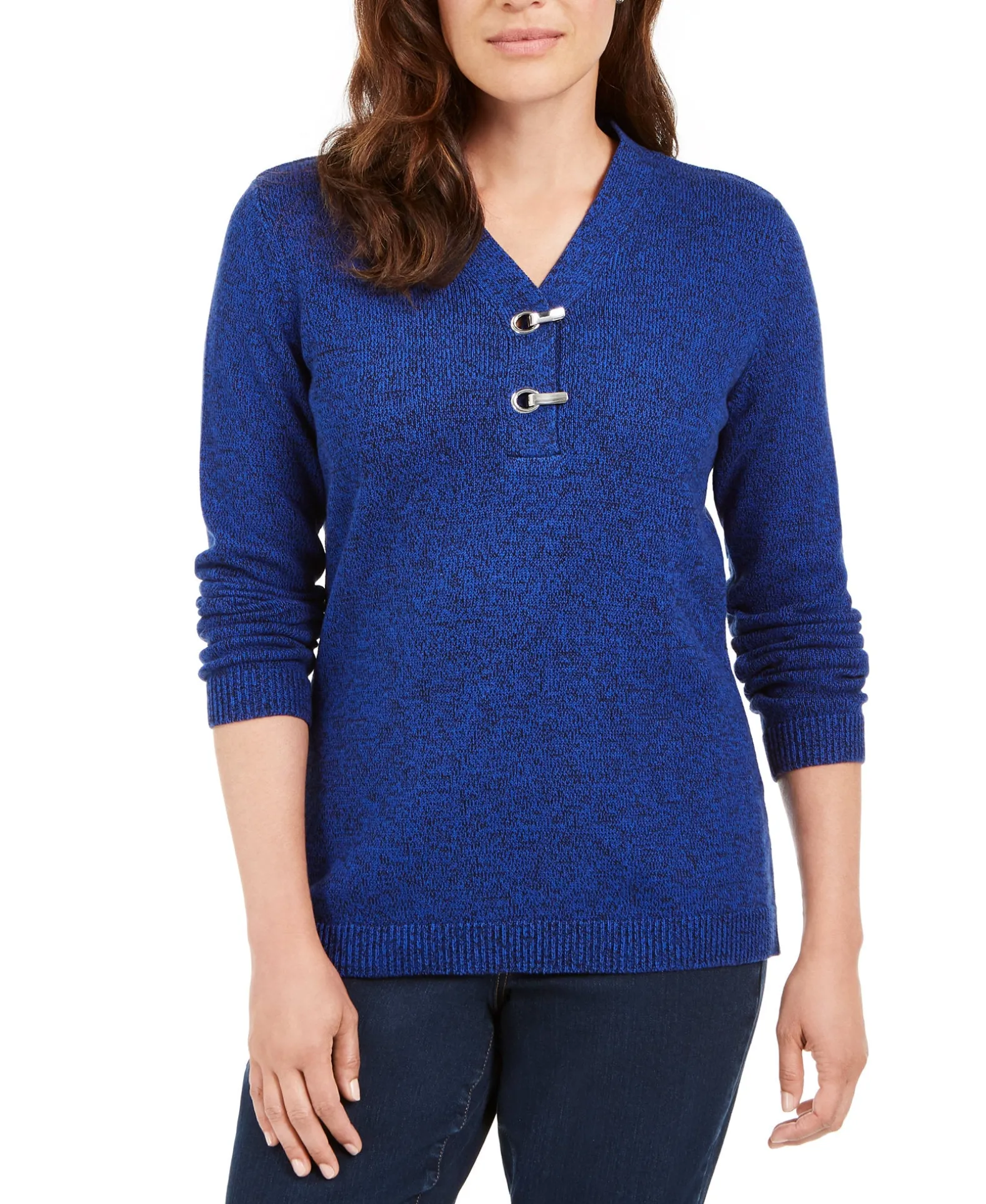 Your Petite Sweater Collection Calls For This Cozy Update: A Henley-Style Knit From Karen Scott, Crafted From Comfortable Cotton And Finished With Chic Hardware Details At The Neck For Adjustable Styling Options.