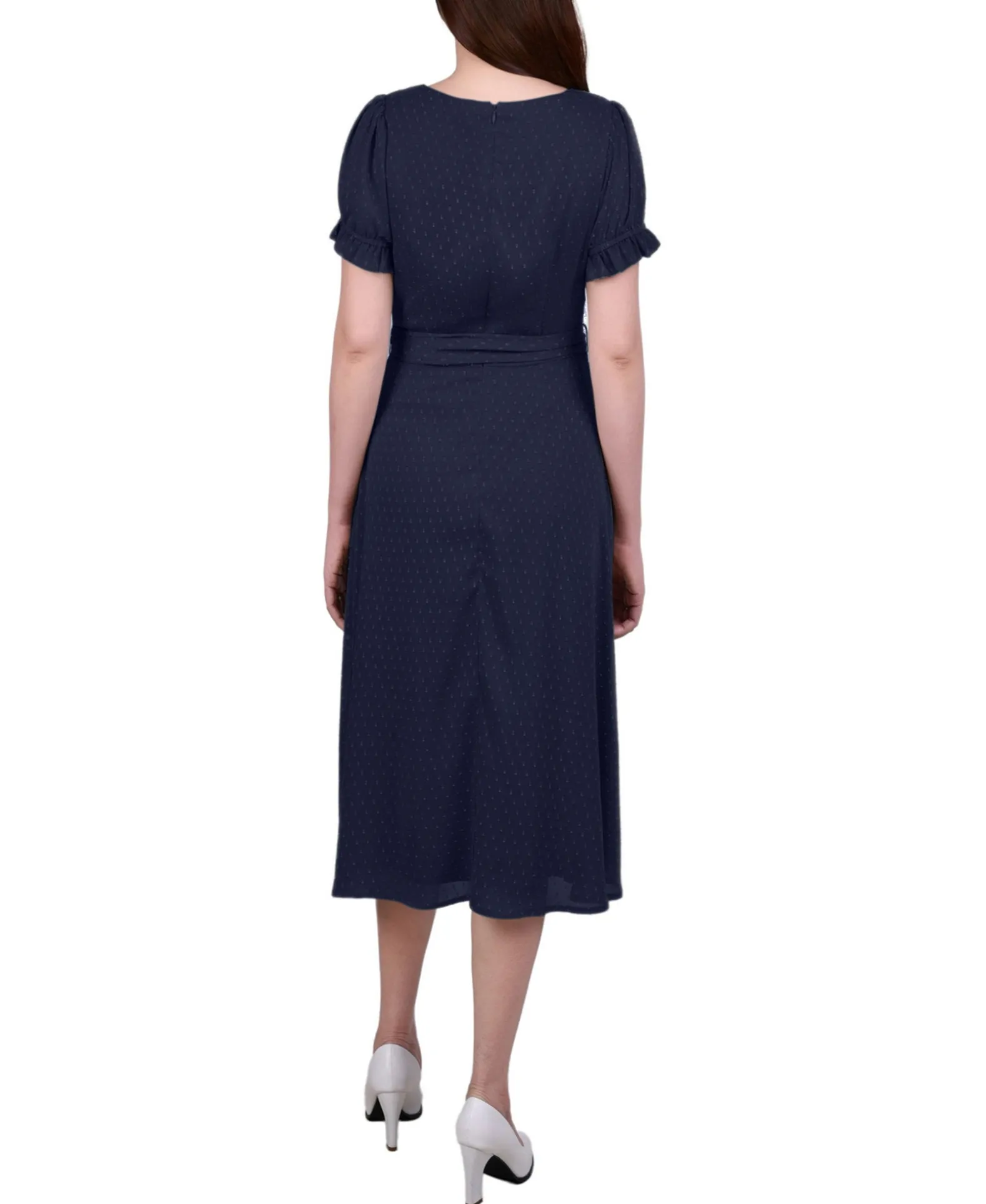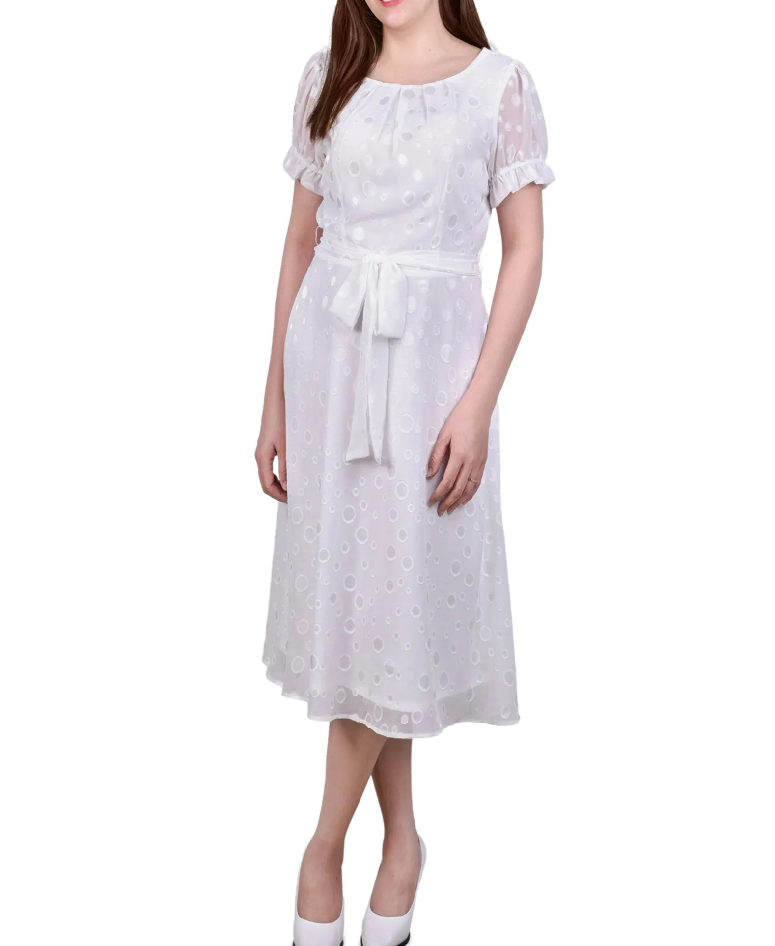 NY Collection Presents This Sweet And Simple Swiss Dot Dress, With A Tie Waist And Ruched Sleeves For The Perfect Special Occasion Dress.