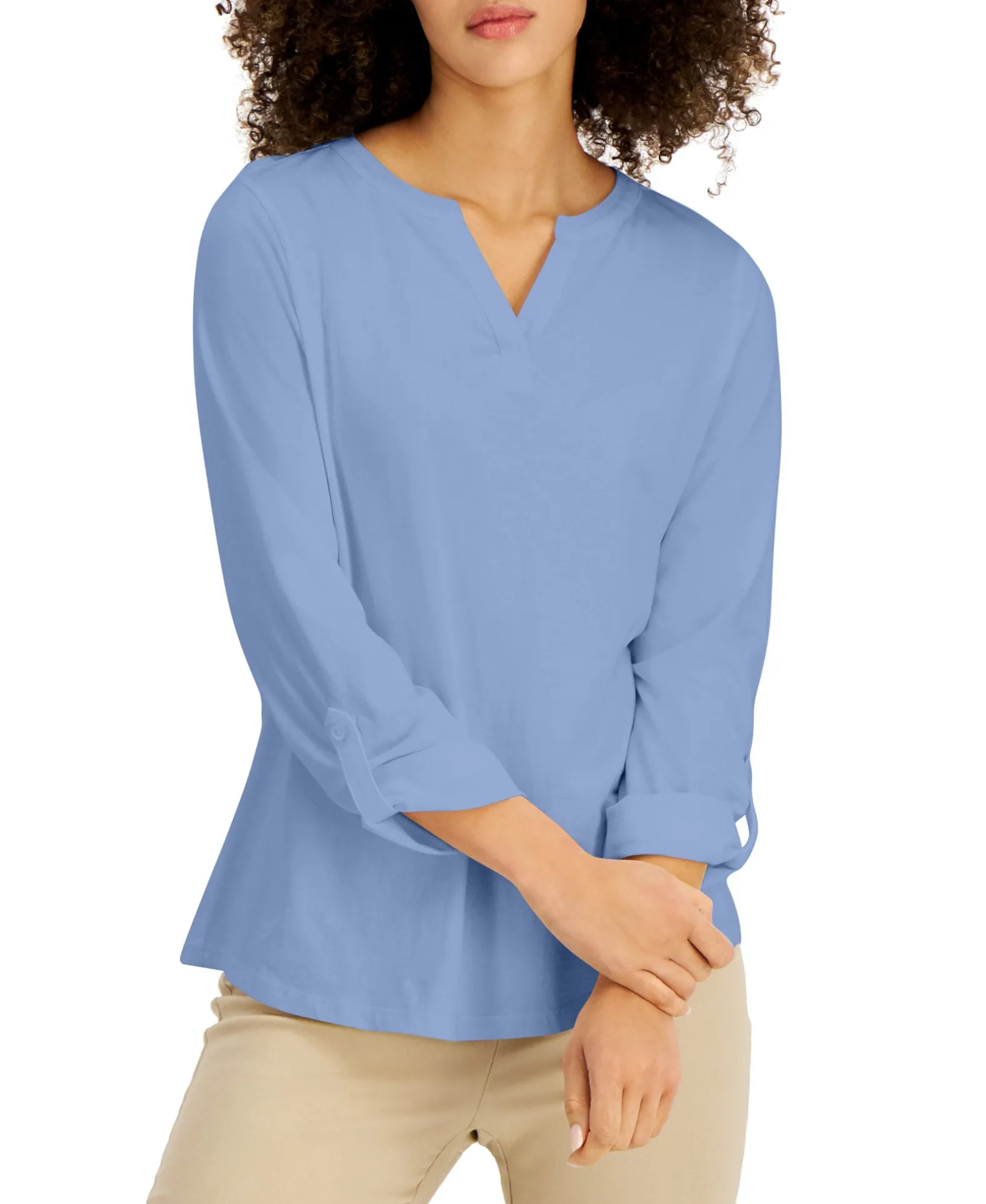 A Split Neck And 3/4 Roll-Tab Sleeve Add Casual Flair To This Petite Pullover Top From Charter Club.