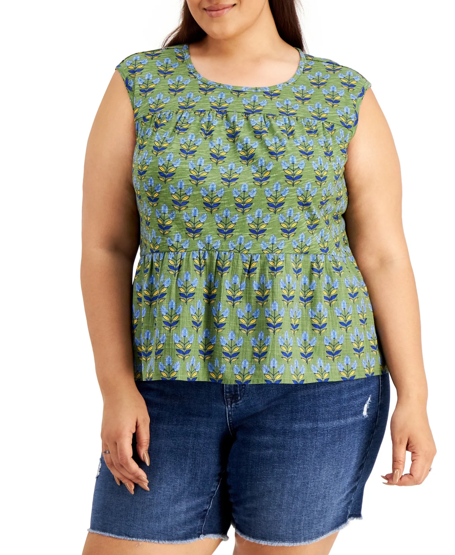 A Pretty Peplum Shapes Style & Co’s Plus Size Top, A Comfortable Cotton Sleeveless Style Accented With A Sweet Print And Small Pleats.
