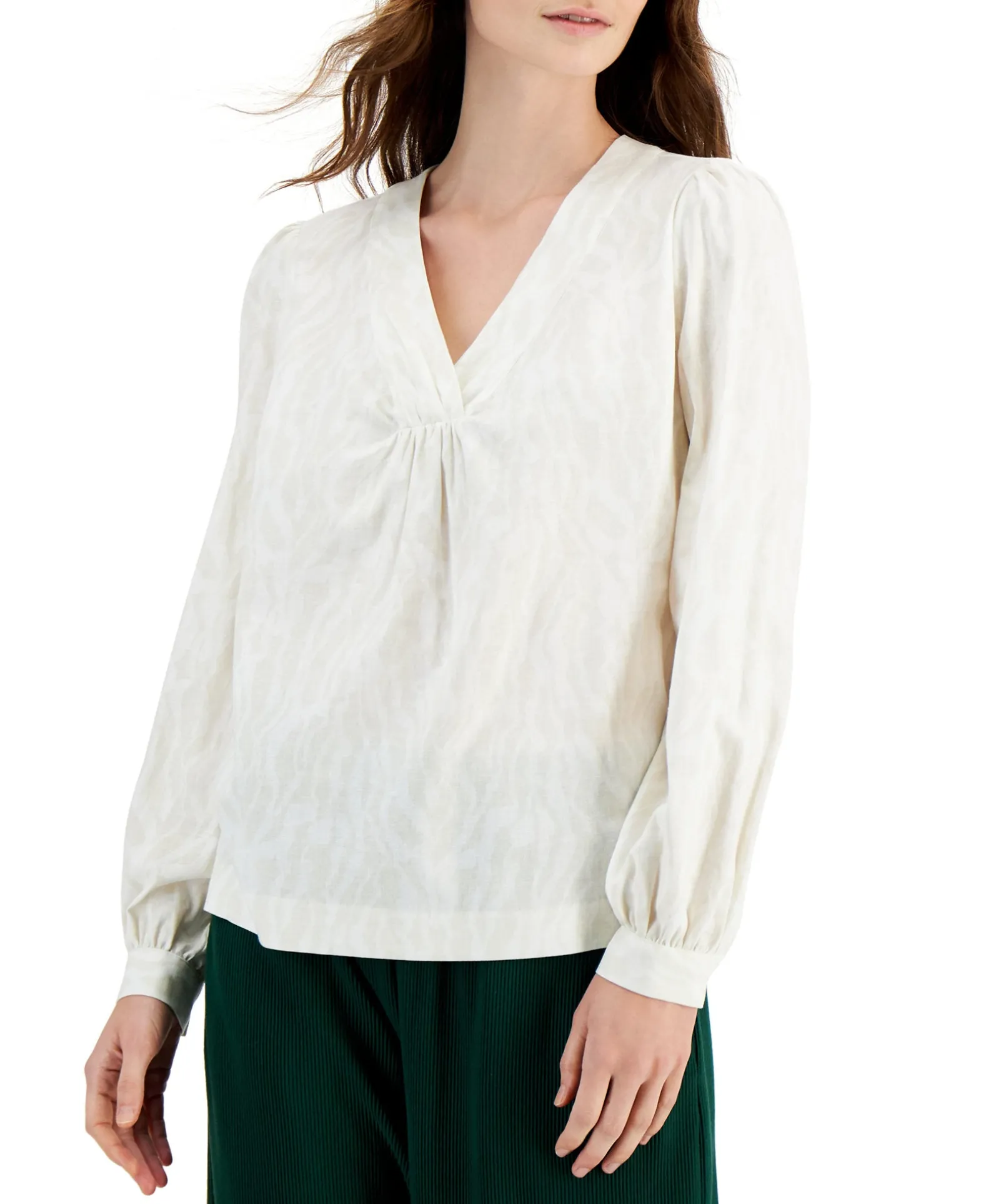 Framed By Graceful Long Blouson Sleeves, Alfani’s V-Neck Top Is Finished With An Abstract Animal Print For A Fashion-Forward Feel.