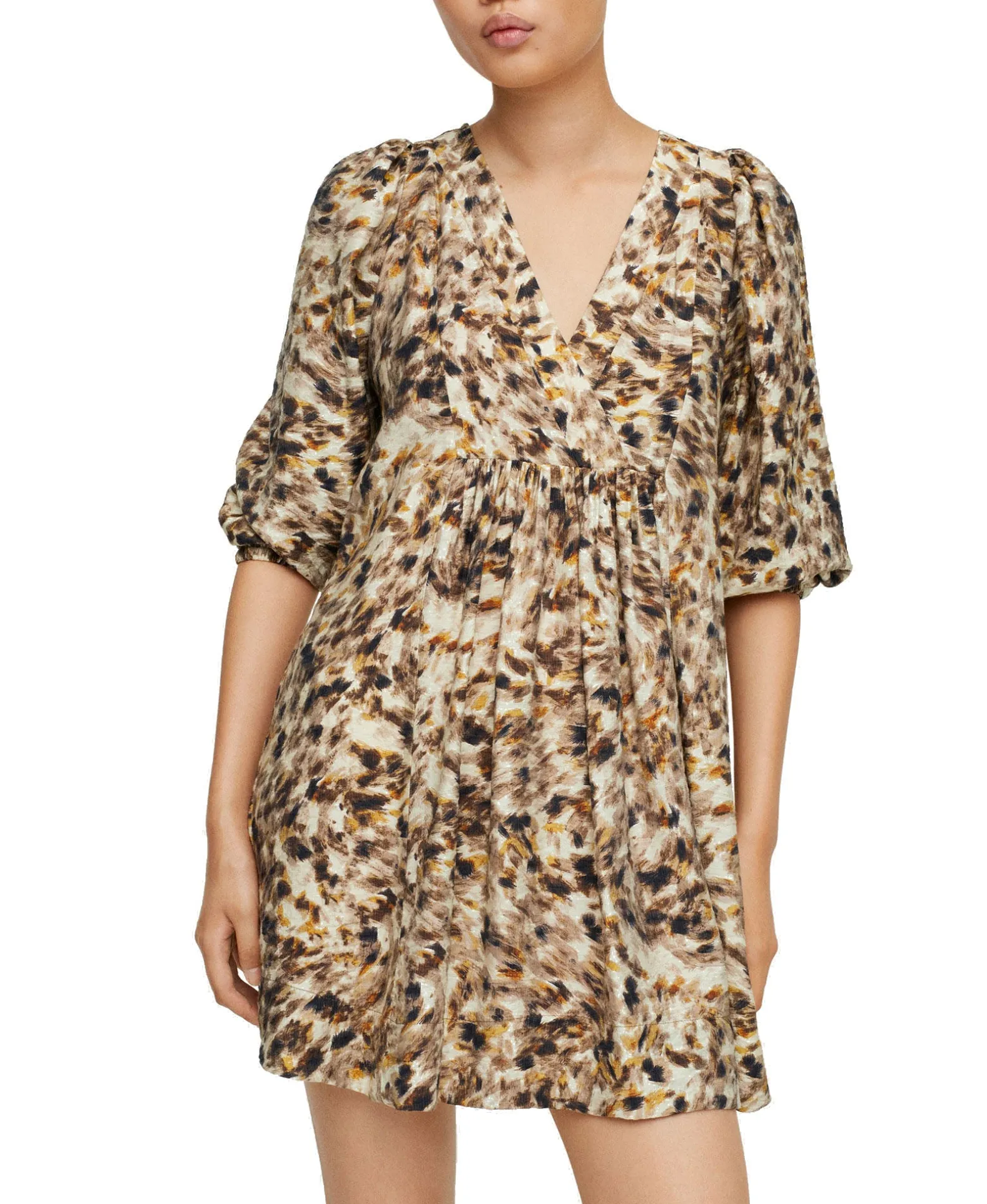 Make A Bold Style Statement By Wearing This Printed Short Dress From MANGO. This Short Dress Is Crafted From Viscose And Polyamide-Blend Fabric, And Features Flared Hem, Crossed V-Neck, And Long Sleeves With Elastic Cuffs.