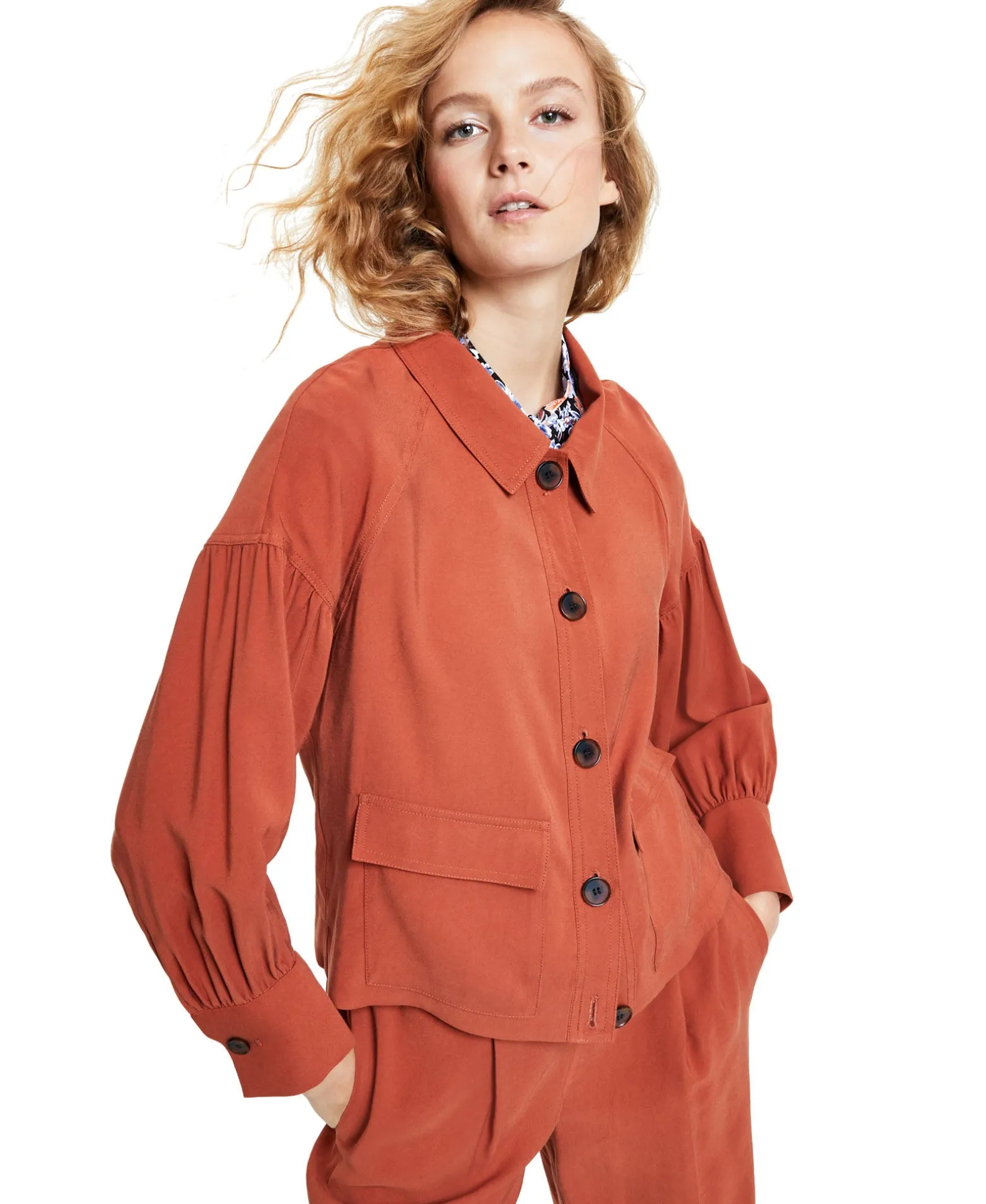 - Long puff sleeves with buttoned cuffs and drop shoulders