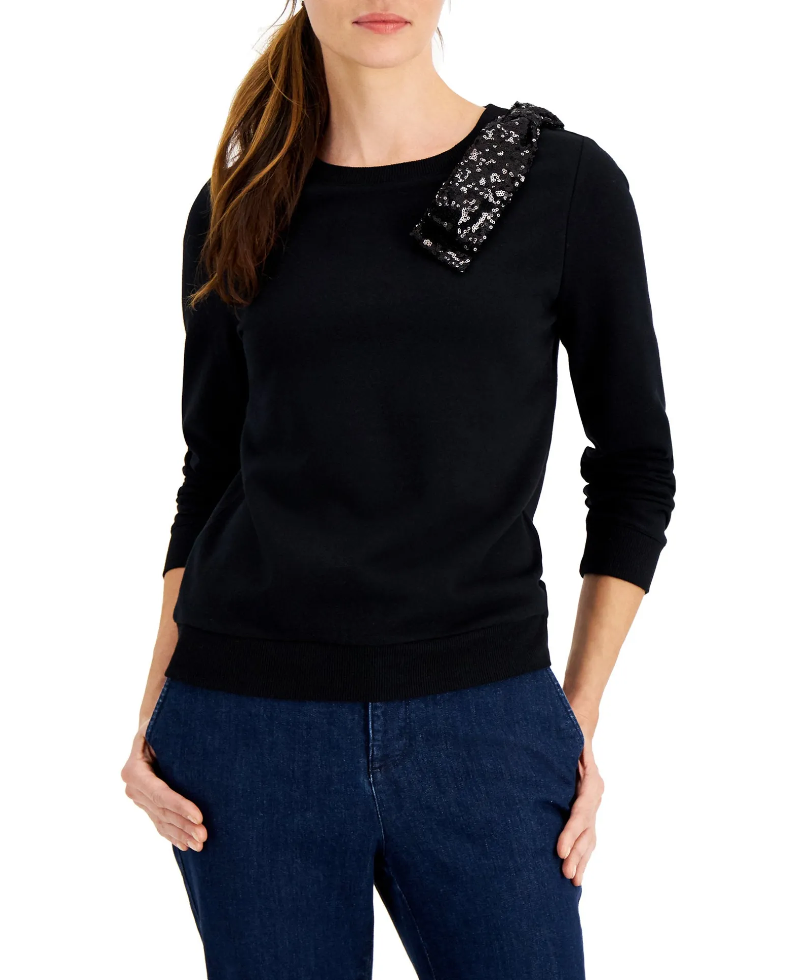 Fierce Style: Charter Club’s Sequined Long Sleeve Top Features A Stylish, Sequined Bow At The Shoulder And Finished With A Ribbed Neckline, Cuffs, And Hem.