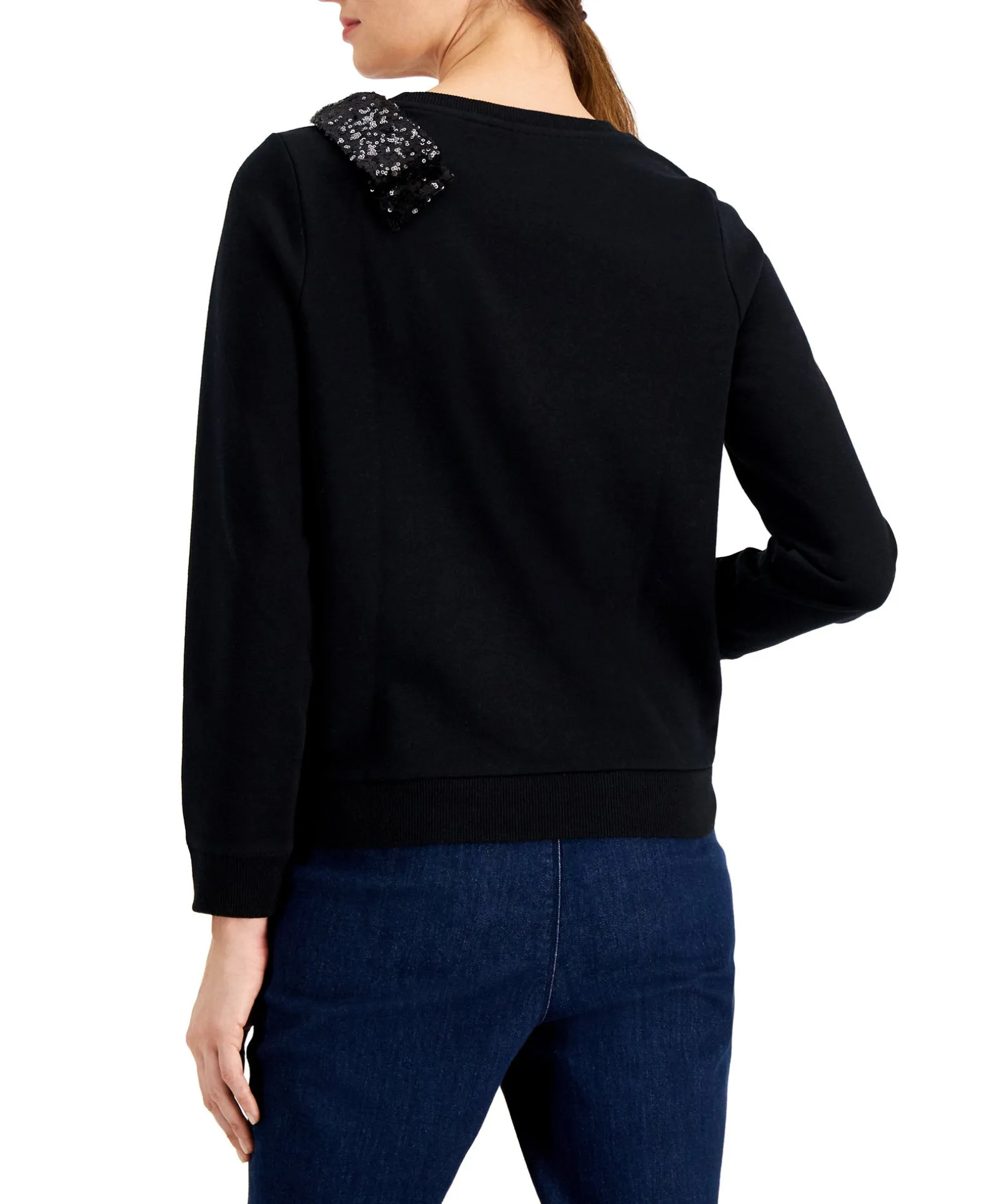 - Sequined bow at shoulder, ribbed neckline, cuffs, and hem