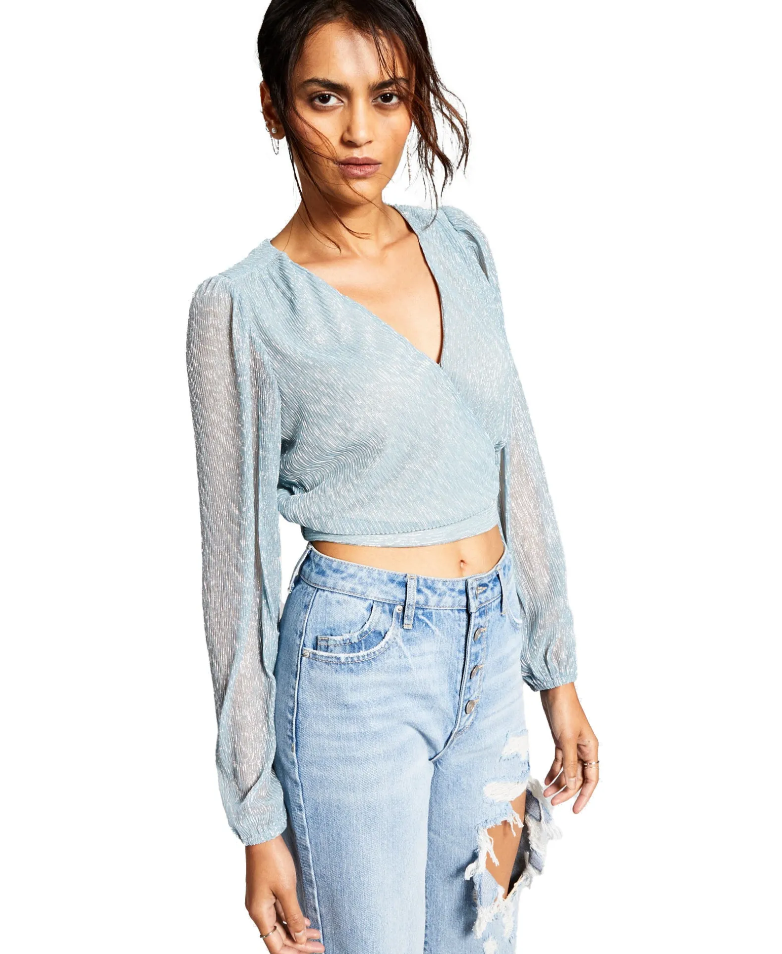 Sparkle The Night Away In This Fabulous Metallic Top From And Now This, A Cool Cropped Silhouette Finished With Semi-Sheer Blouson Sleeves For Added Fun.