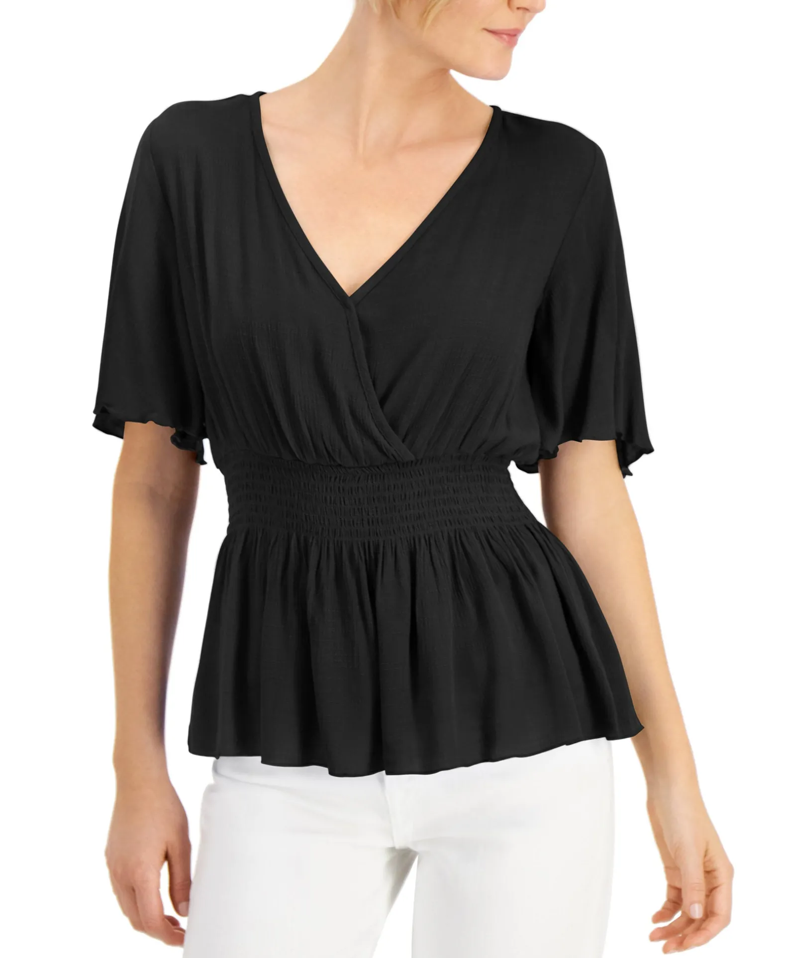 JPR Studio Gives You A Dose Of Versatile Weekday Style In This Surplice Top With A Smocked Waist, Peplum Hem, And Flutter Sleeves.