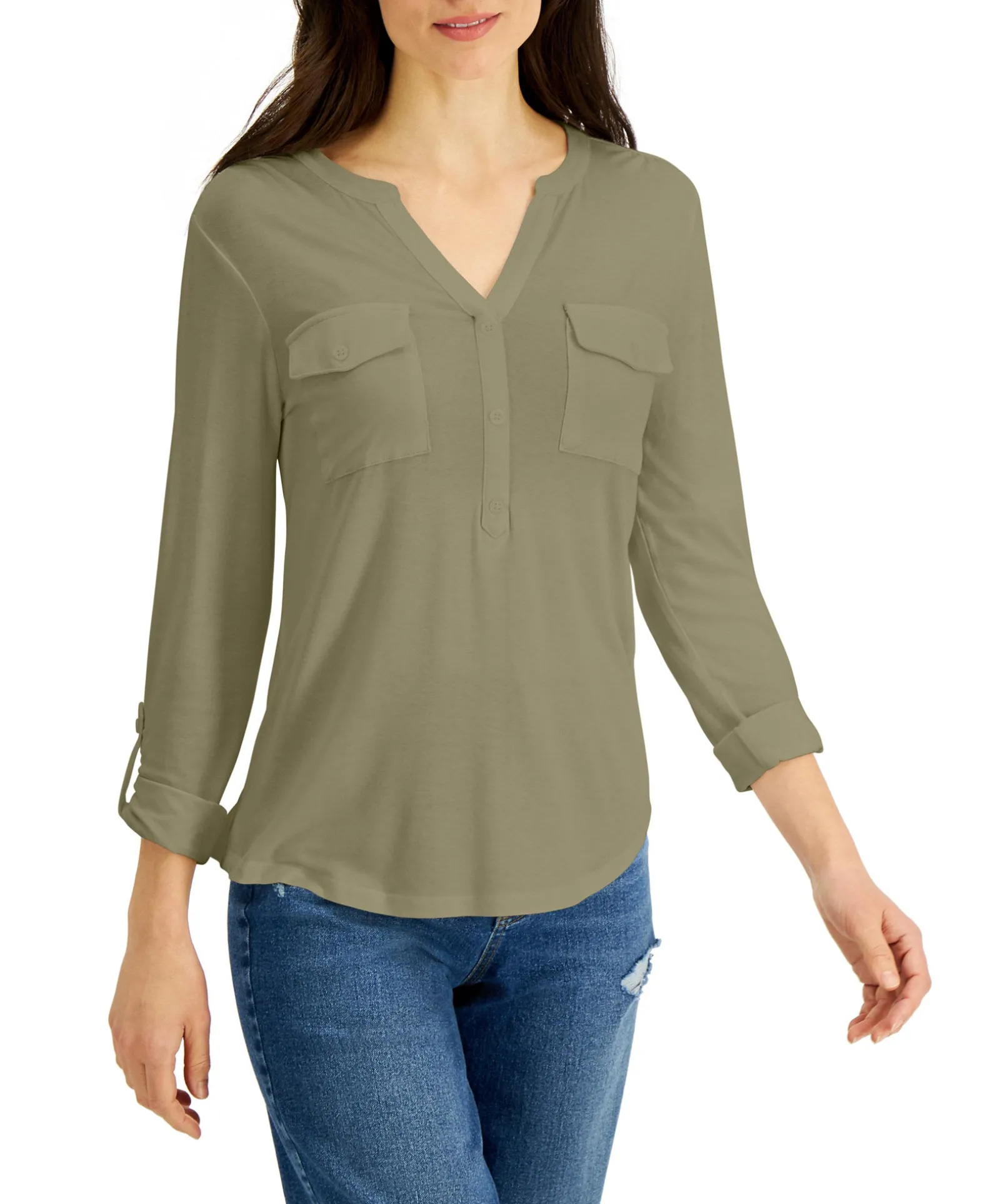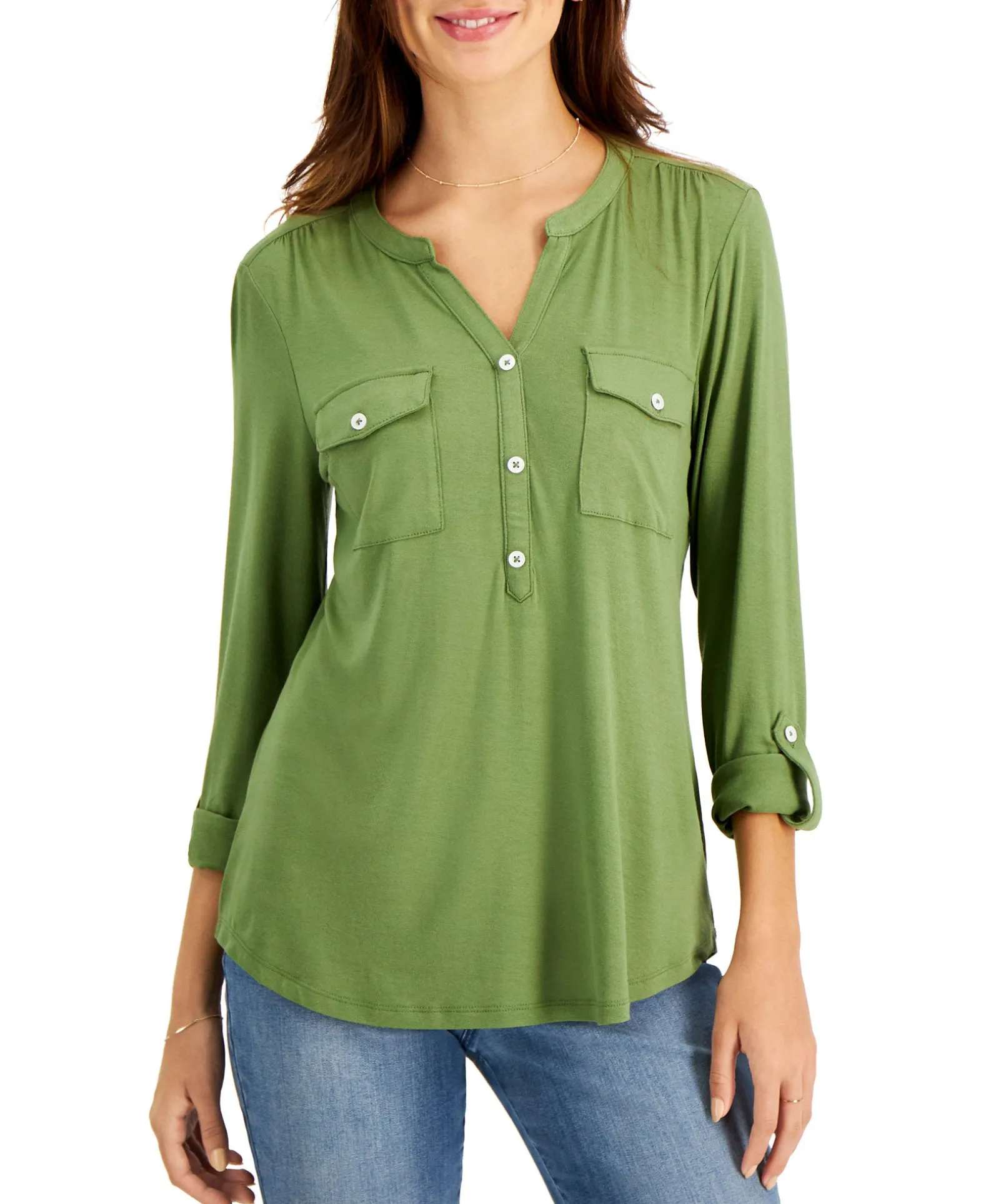 Classic, Collarless And Full Of Wardrobe Possibilities, Style & Co’s Split-Neck Top Sports Smart Roll-Tab Sleeves.