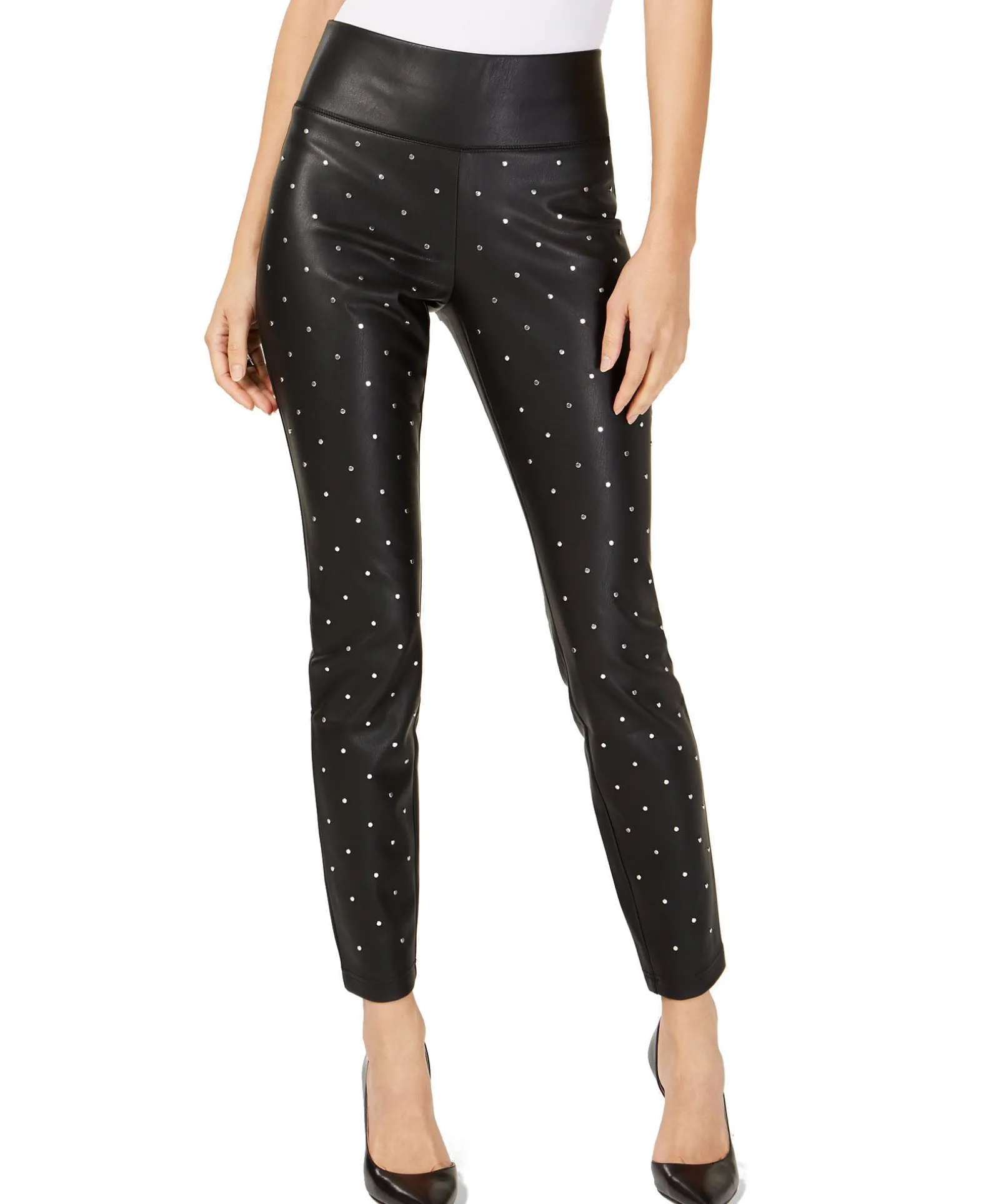 Sleek and chic, these faux-leather skinny pants from I.N.C. International Concepts shine with cool silver-tone studs.