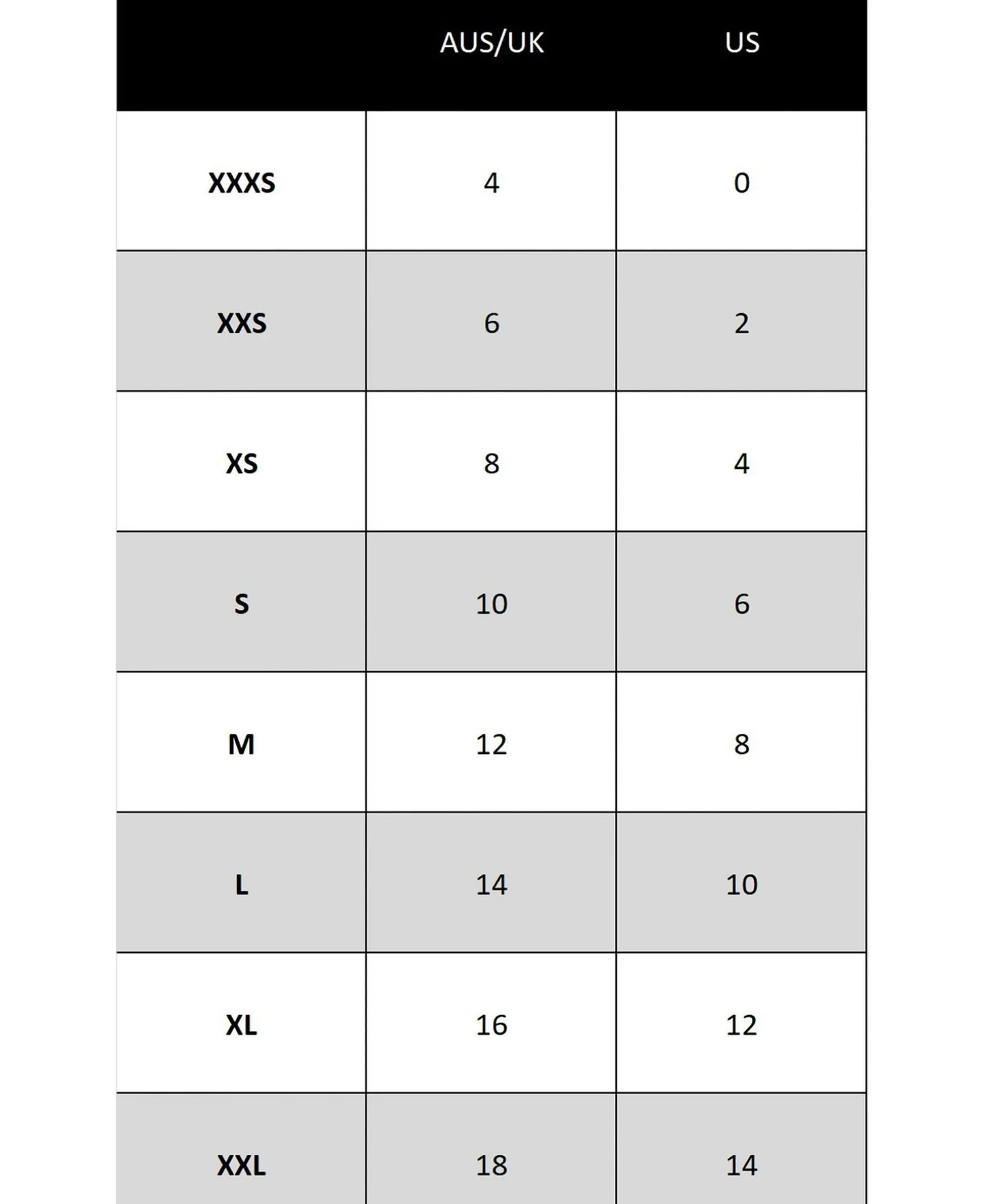 - Sizing conversions (extended): US 0 = XXXS/AUS 4, US 2 = XXS/AUS 6, US 4 = XS/AUS 8, US 6 = S/AUS 10, US 8 = M/AUS 12, US 10 = L/AUS 14, US 12 = XL/AUS 16, US 14 = XXL/AUS 18