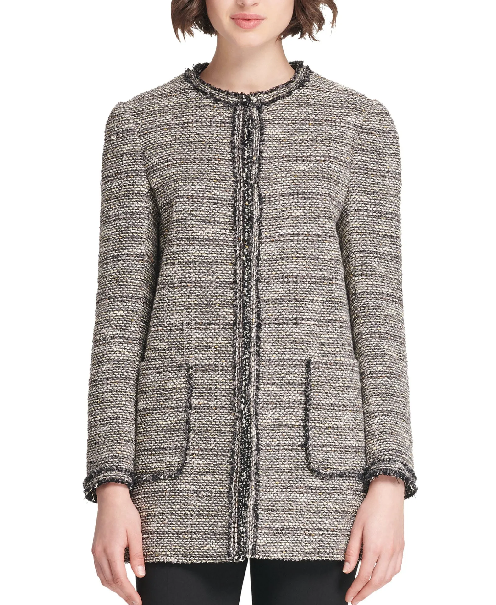 opt for a modern take on a classic texture with this elongated jacket from dkny, cut in colorful tweed with subtle fringed trim.