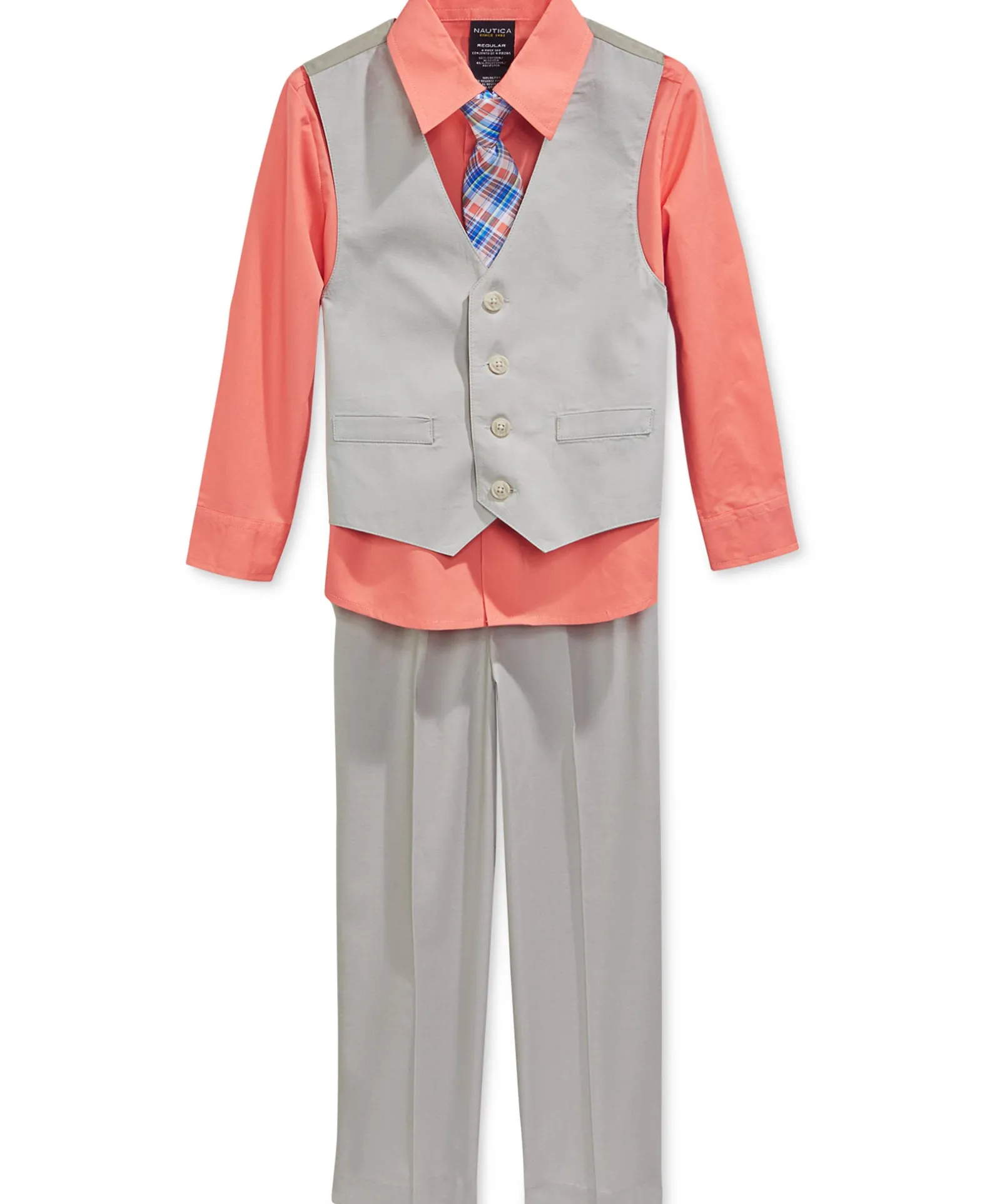 A little bit posh and a lot stylish, this four-piece Nautica set features a vest, shirt, tie and elastic-waist pants.