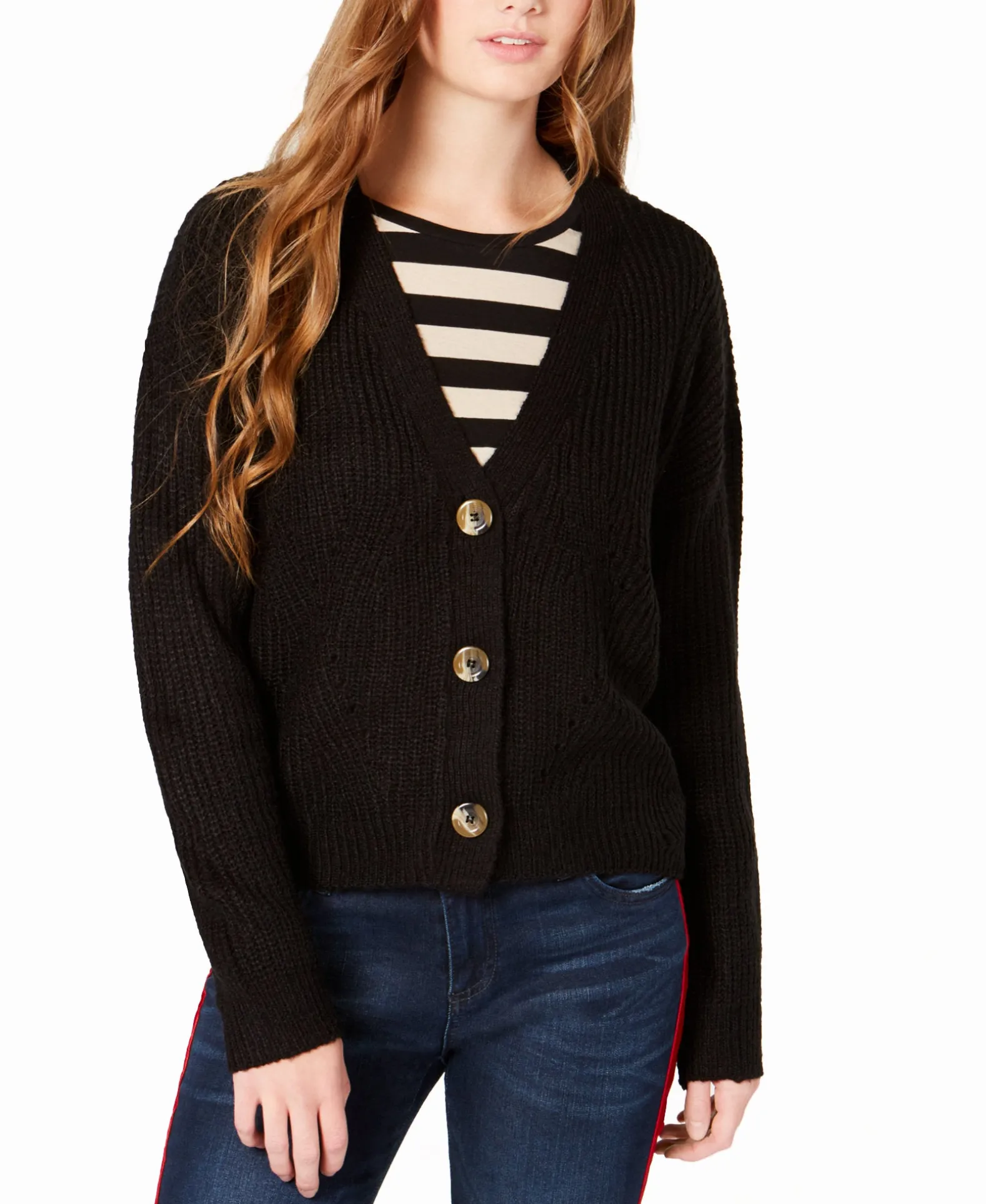 Ultra Flirt’s cardigan offers a classic with a twist, due to a cool cropped silhouette and sleek V-neckline.