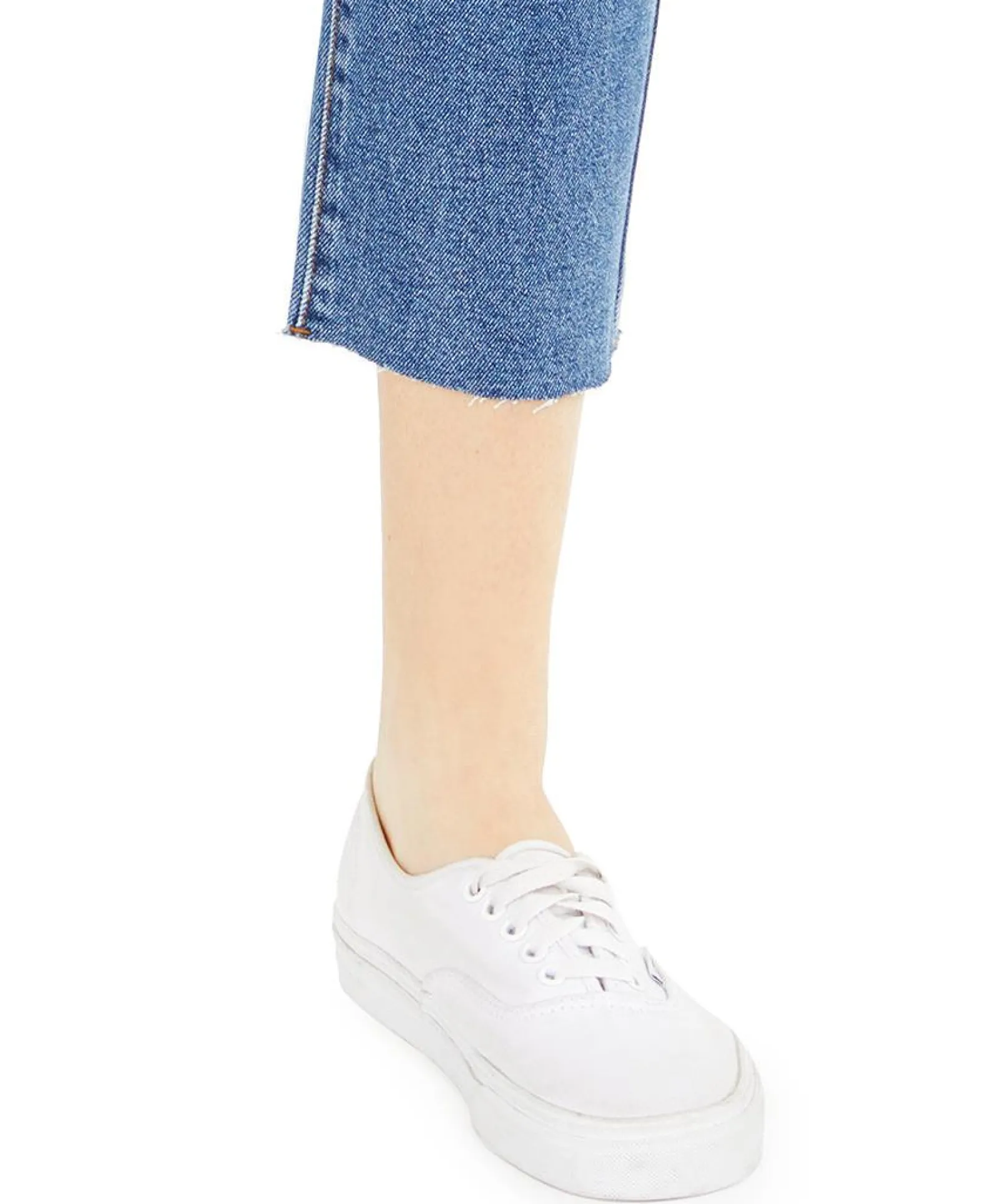 - Front whiskering; fading throughout; cropped legs with raw-edge hems