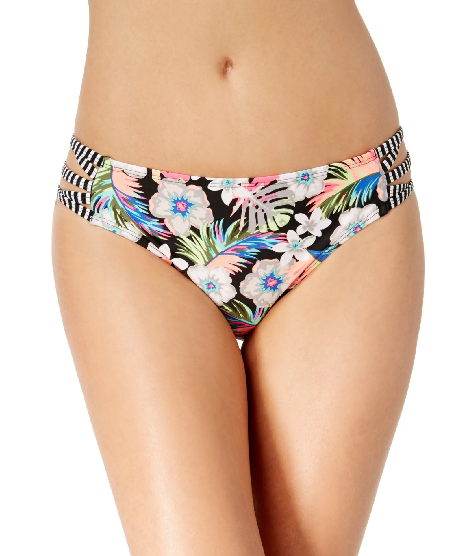Tropical florals team up with two-tone strappy stripes in California Waves’ hipster bikini bottoms