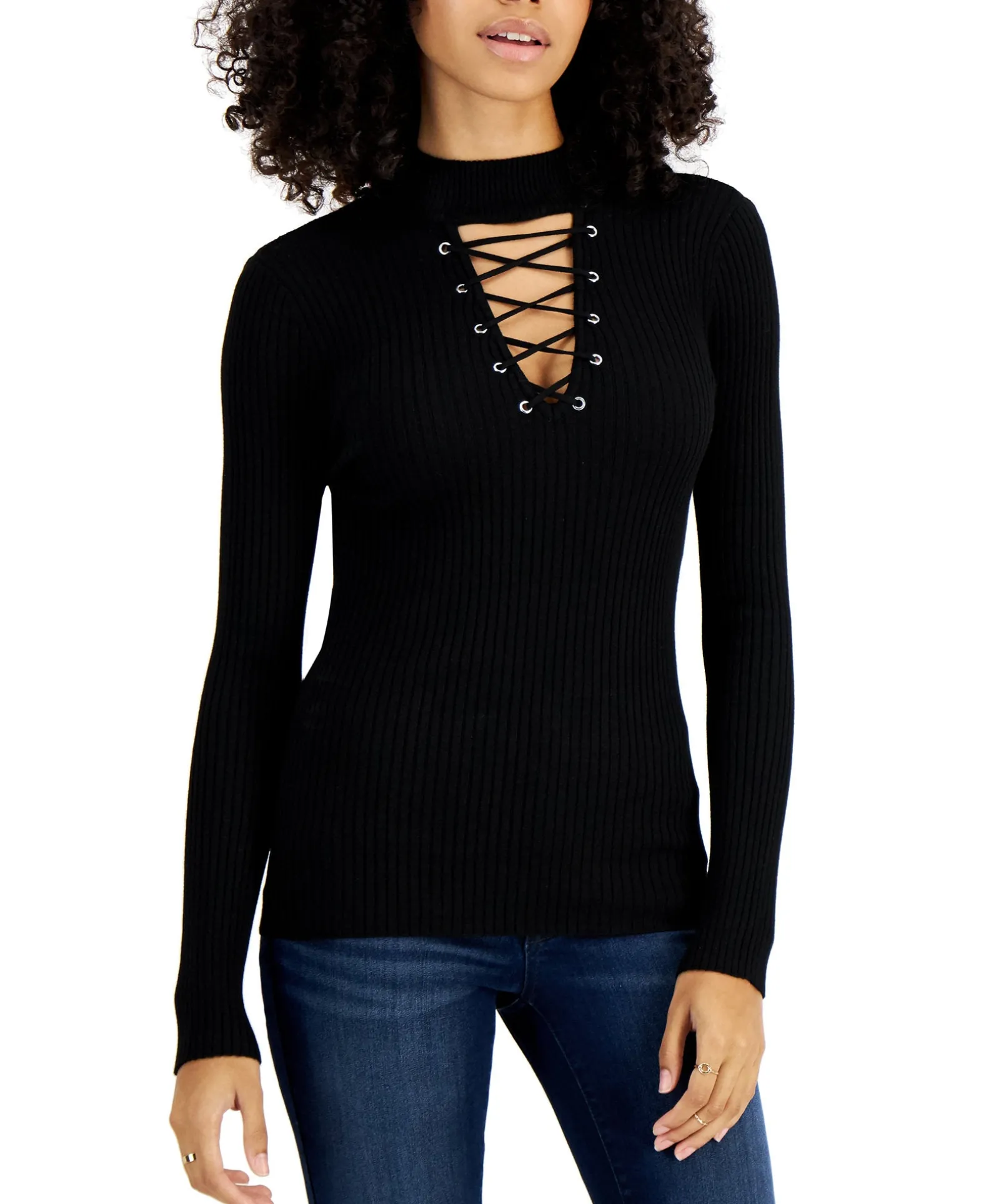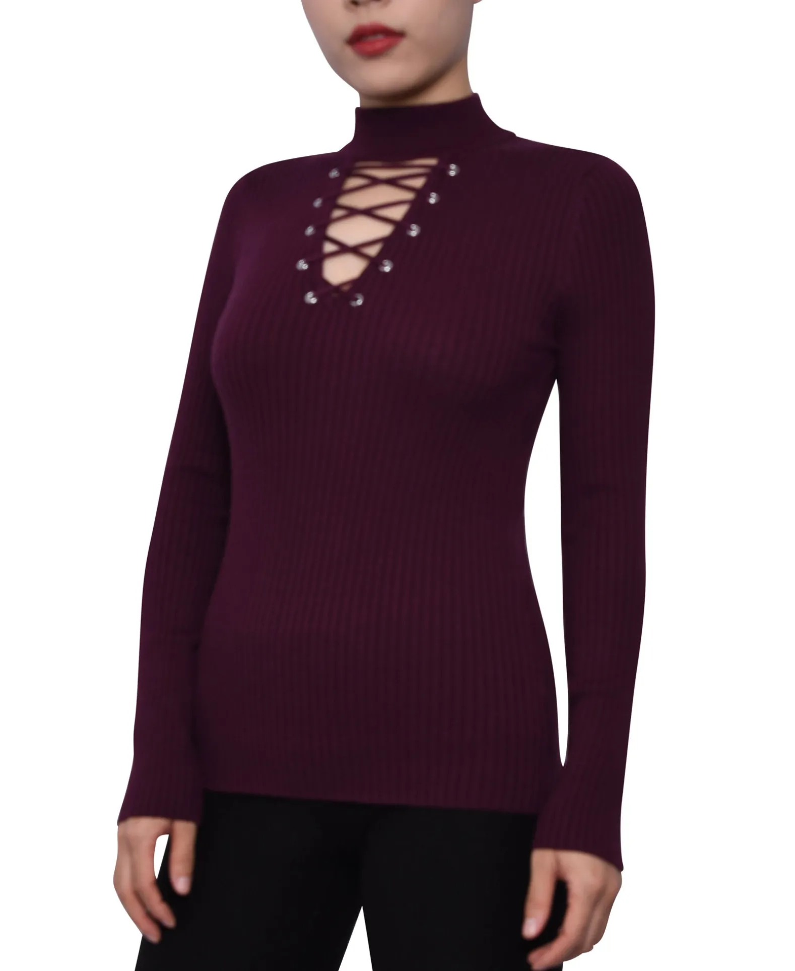 An Edgy Lace-Up Detail Meets A Sleek Mock Neckline For Sophisticated Modern Style On This Sleek Sweater From Planet Gold.