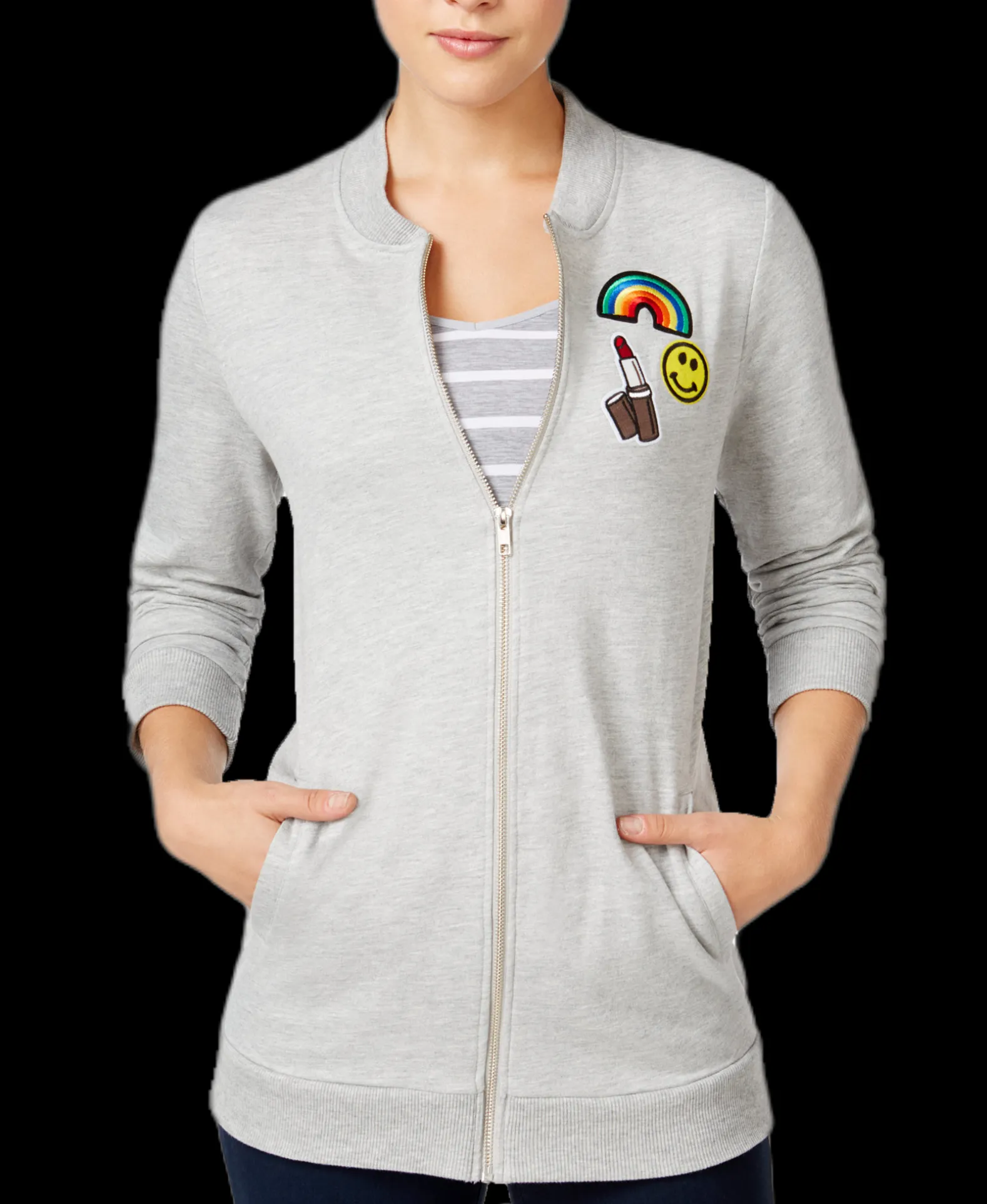 A trend-right top layer for your casual collection, Almost Famous’ bomber jacket features contrast knit fabric, rib-knit trim and front patch details.