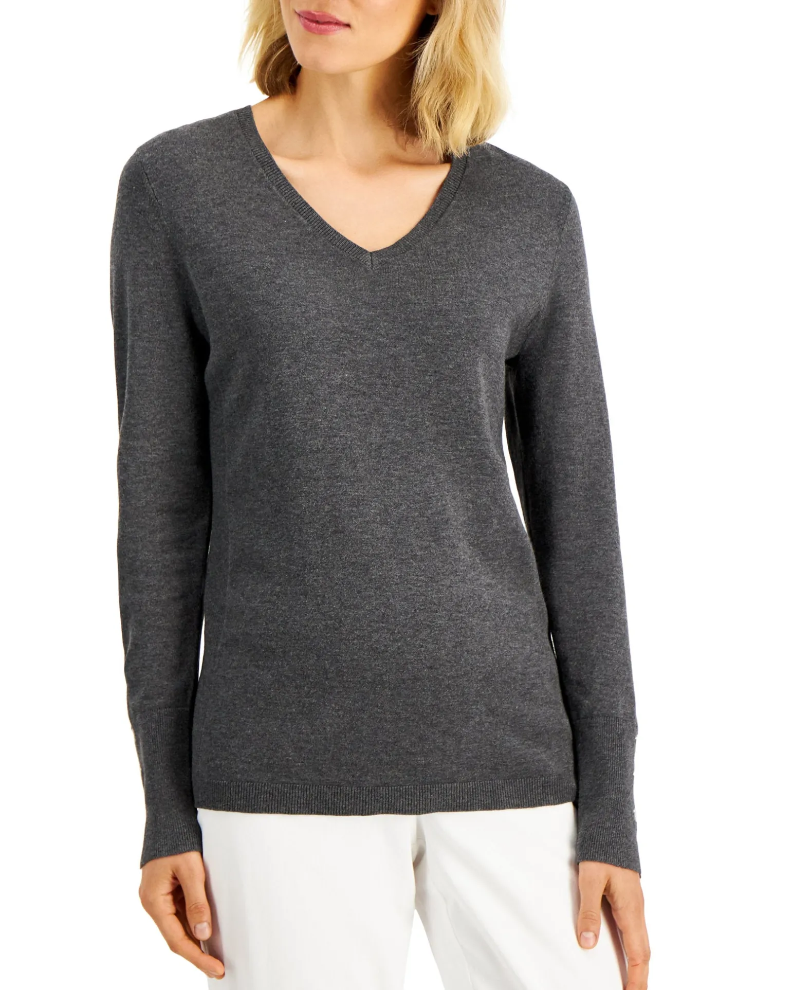 Pretty Buttons At The Cuffs Elevate This Look From JM Collection, A V-Neck Sweater With Stylish Distinction.
