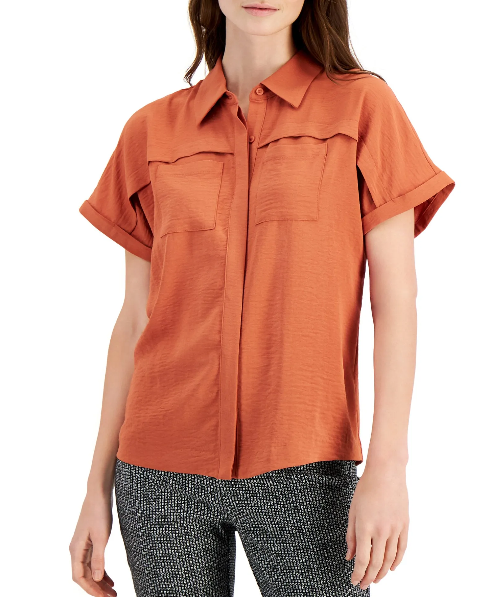 Alfani Updates The Timeless Button-Front Top With Breezy Short Sleeves For Warm-Weather Wardrobe Perfection.