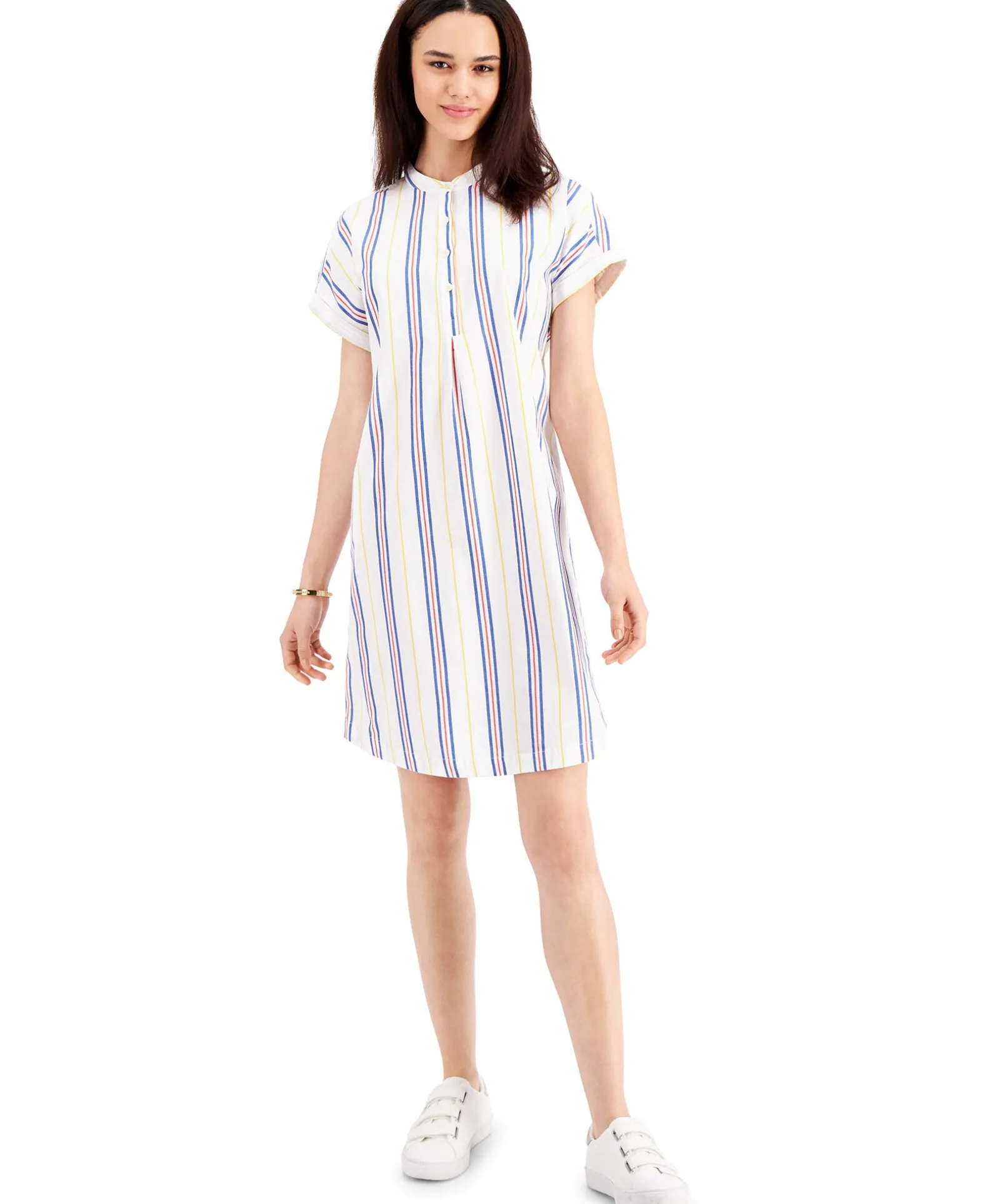 Style & Co Brings An Eye-Catching Pop Of Color To Your Wardrobe With This Cotton Shirtdress, Just In Time For Warmer Weather.