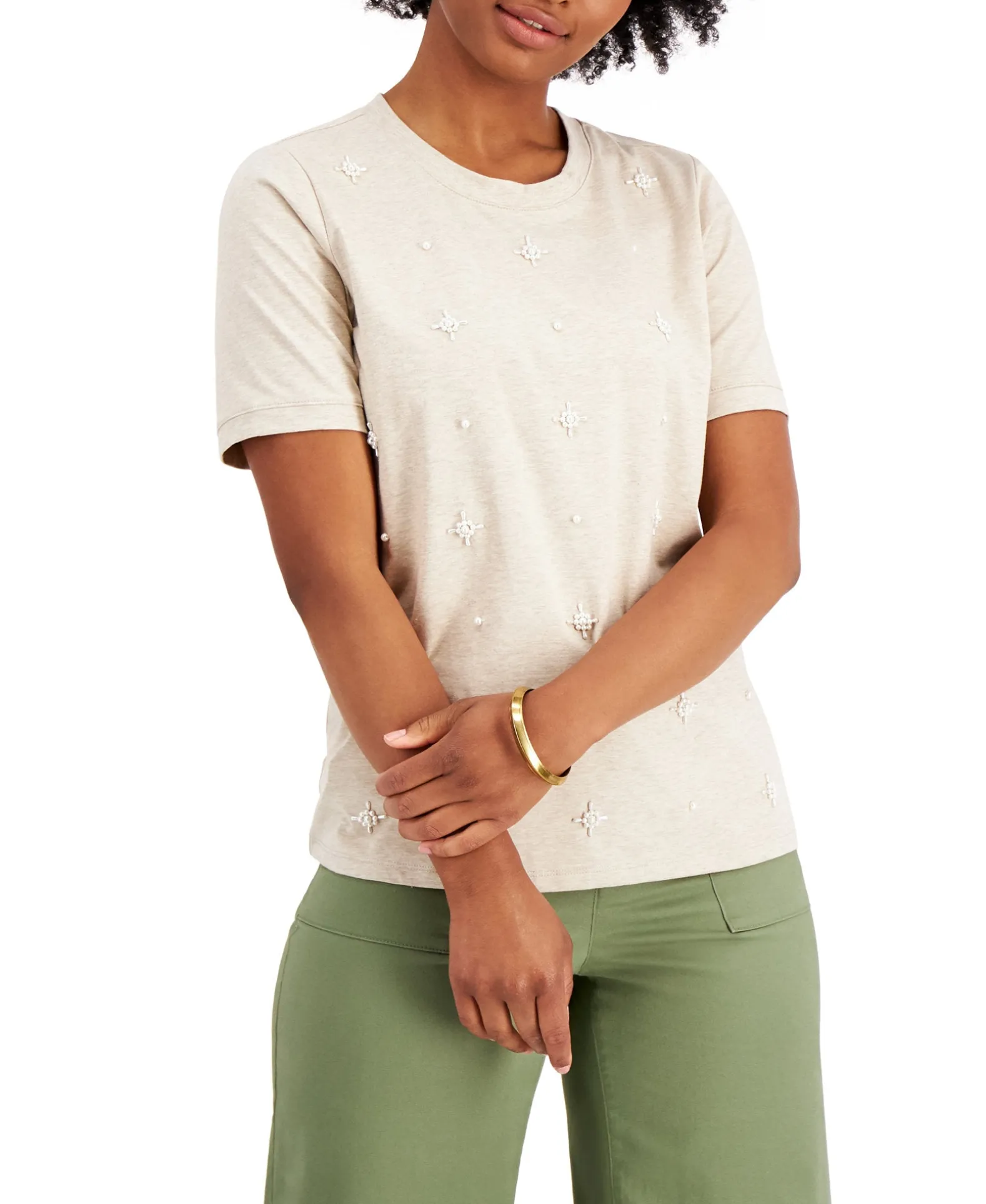 Embellished With Pearl-Inspired Rhinestones, This Option From Charter Club Adds Subtle Eye-Catching Upgrades To The Classic Crewneck T-Shirt, Adding The Perfect Foundation Piece To Layer Under Chic Jackets And Pair With Stylish Accessories.