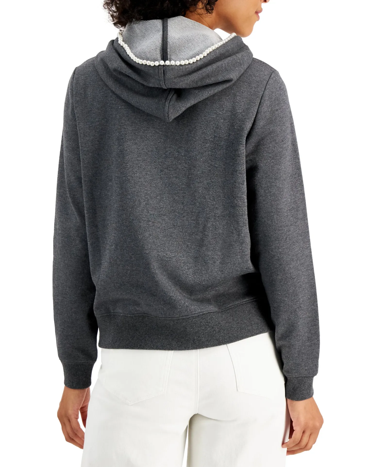 - Drawstring hood with imitation pearl embellishments