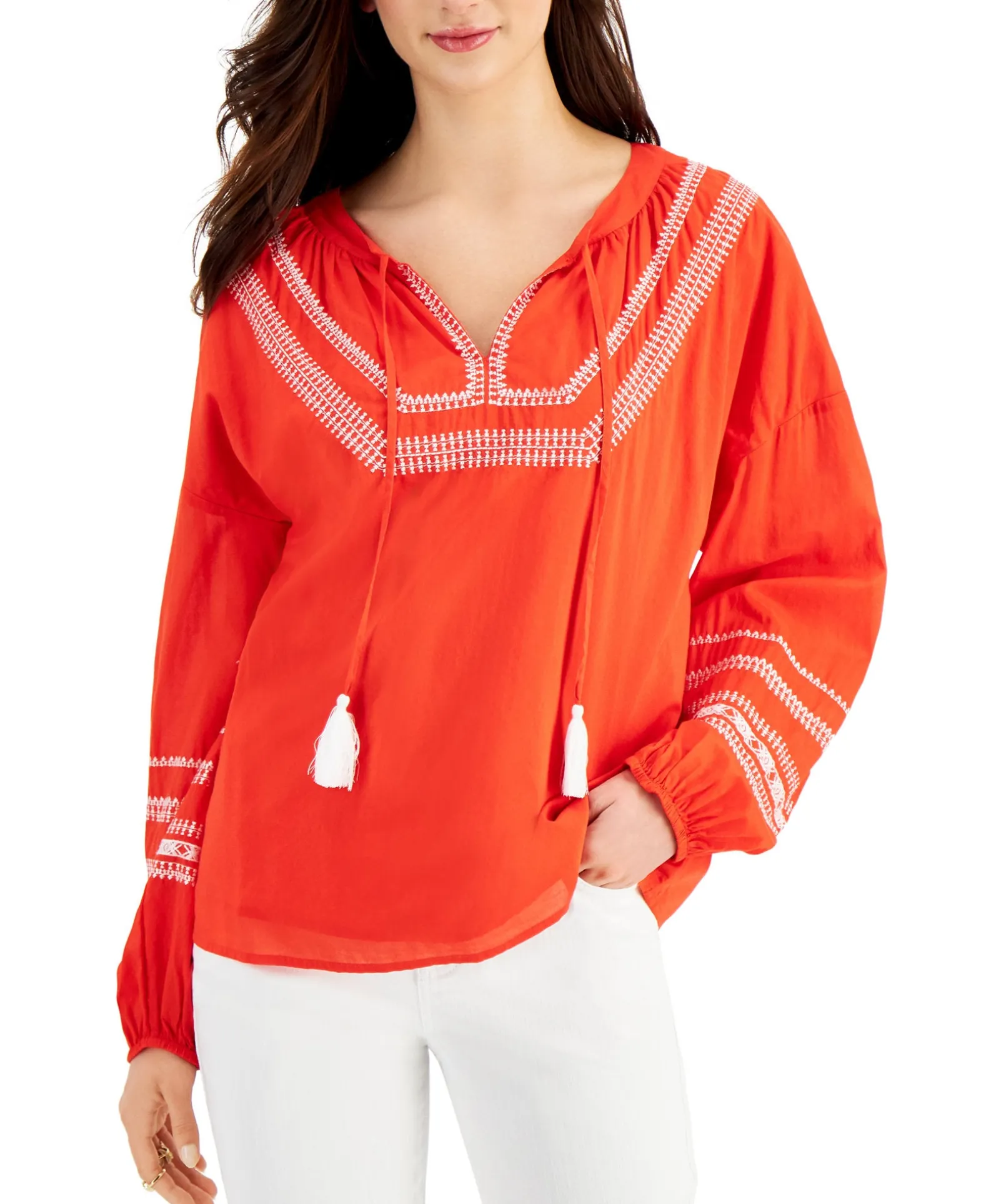 Opt For A Breezy Boho Vibe With This Peasant Top From Style & Co. Swingy Tassel Ties And Soft Embroidery Complete The Flowy Look.
