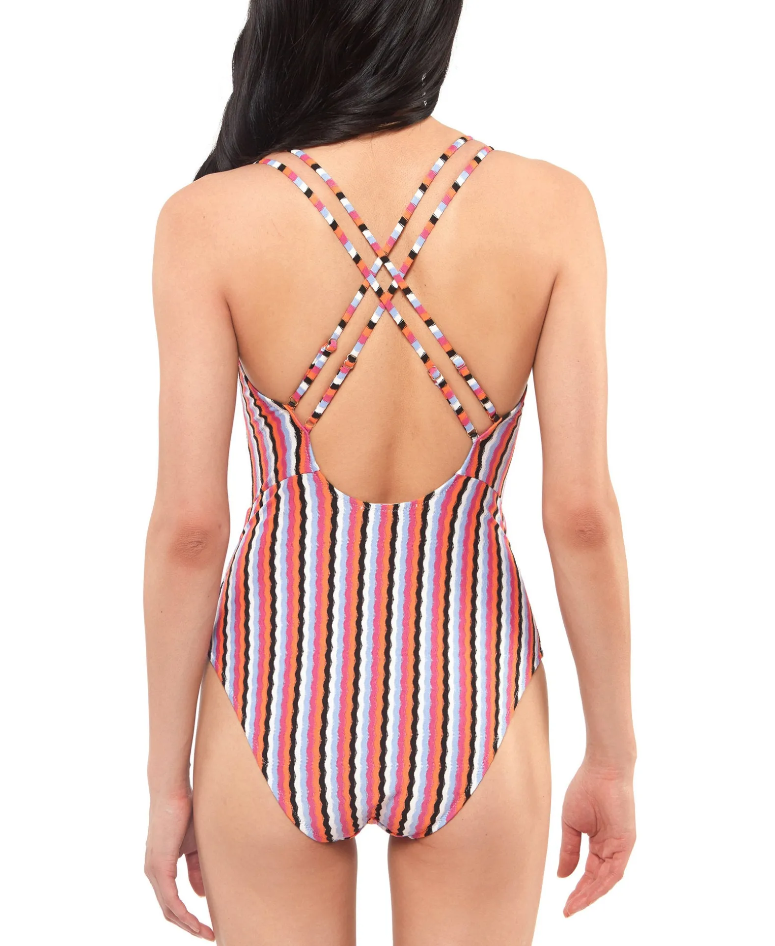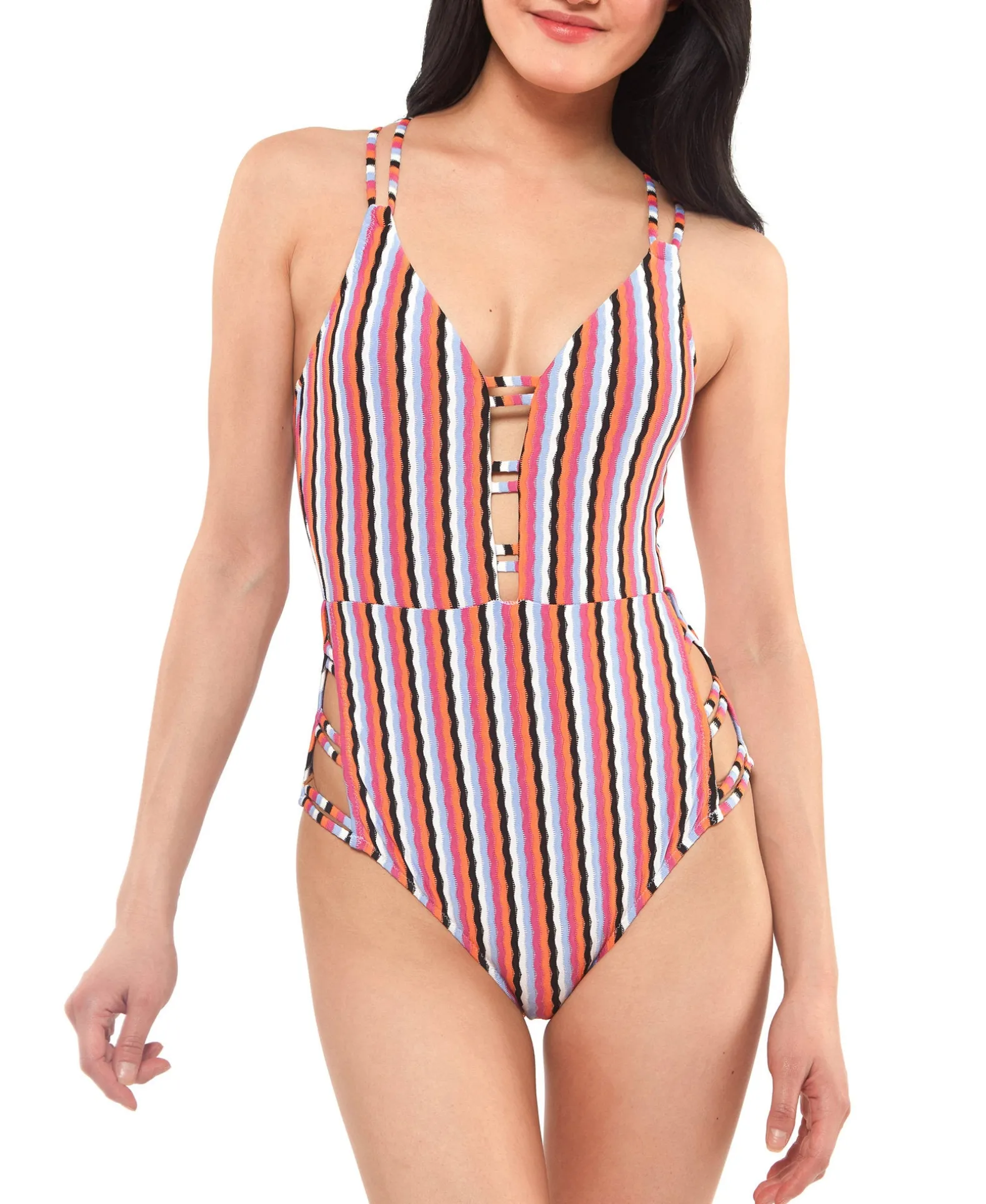 Squiggly Lines And Seductive Cutouts With Strappy Details Define This Alluring Plunge-Neck One-Piece Swimsuit From Jessica Simpson.
