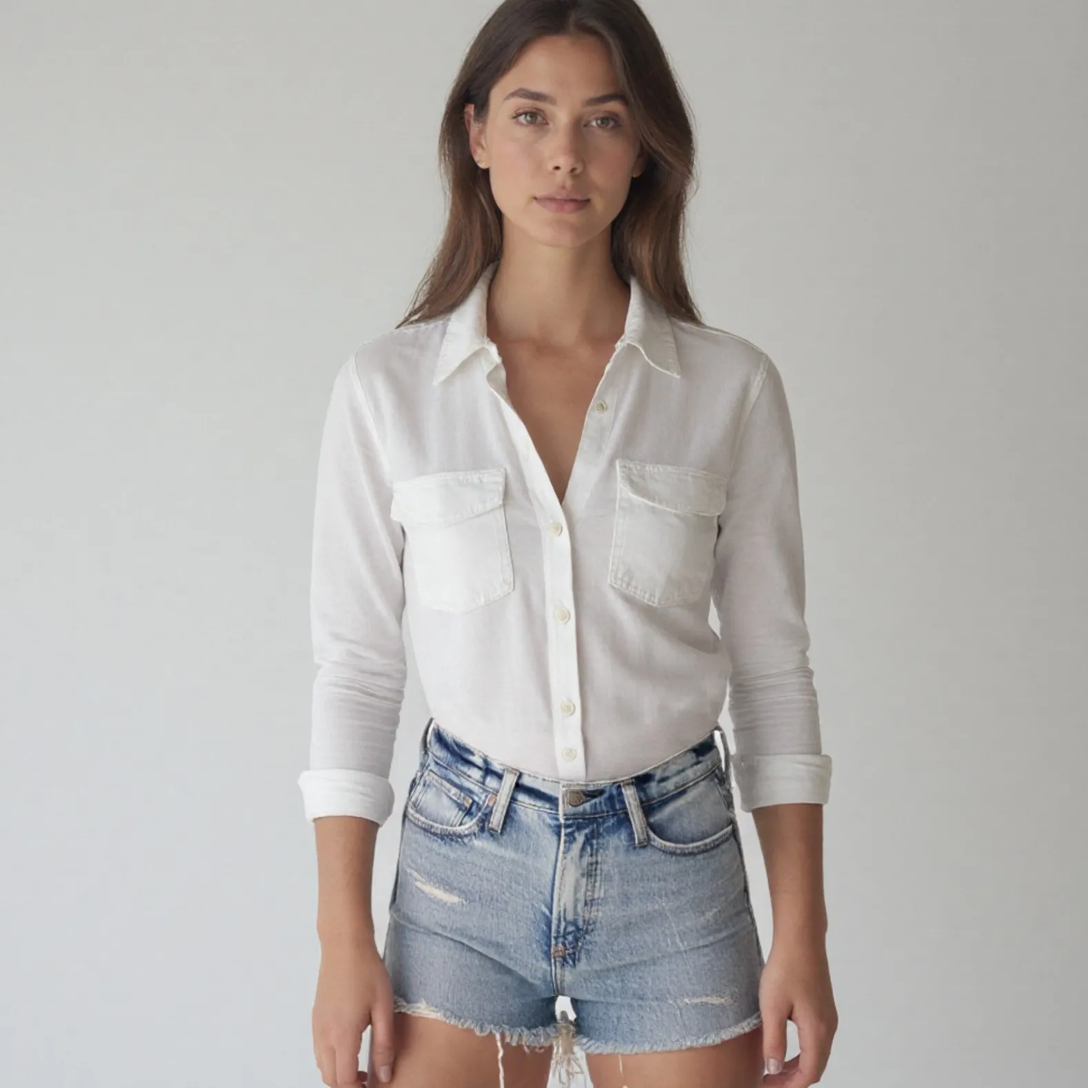 - Distressed details at front; frayed hem