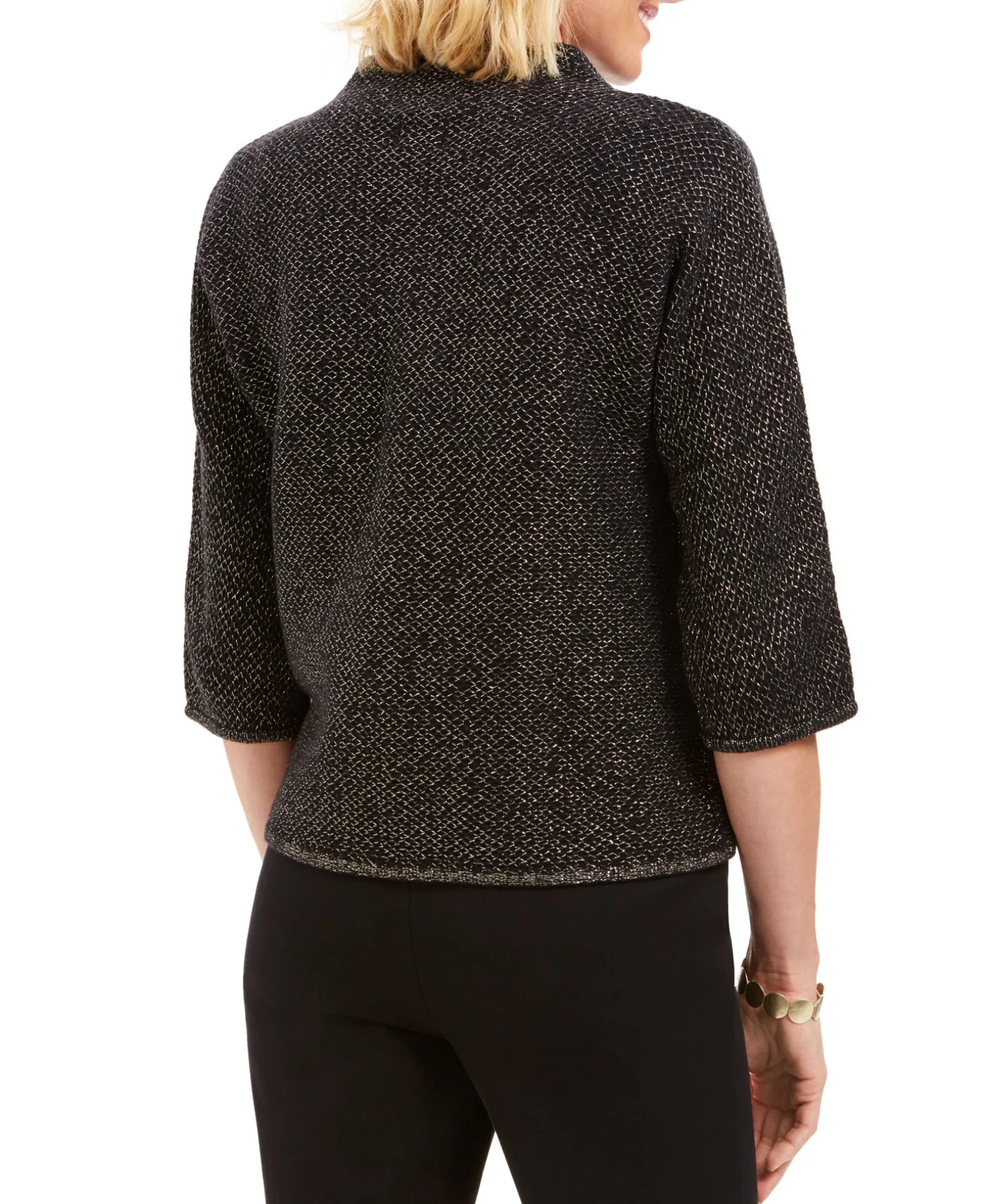 - Allover metallic textured knit; brooch accent at front