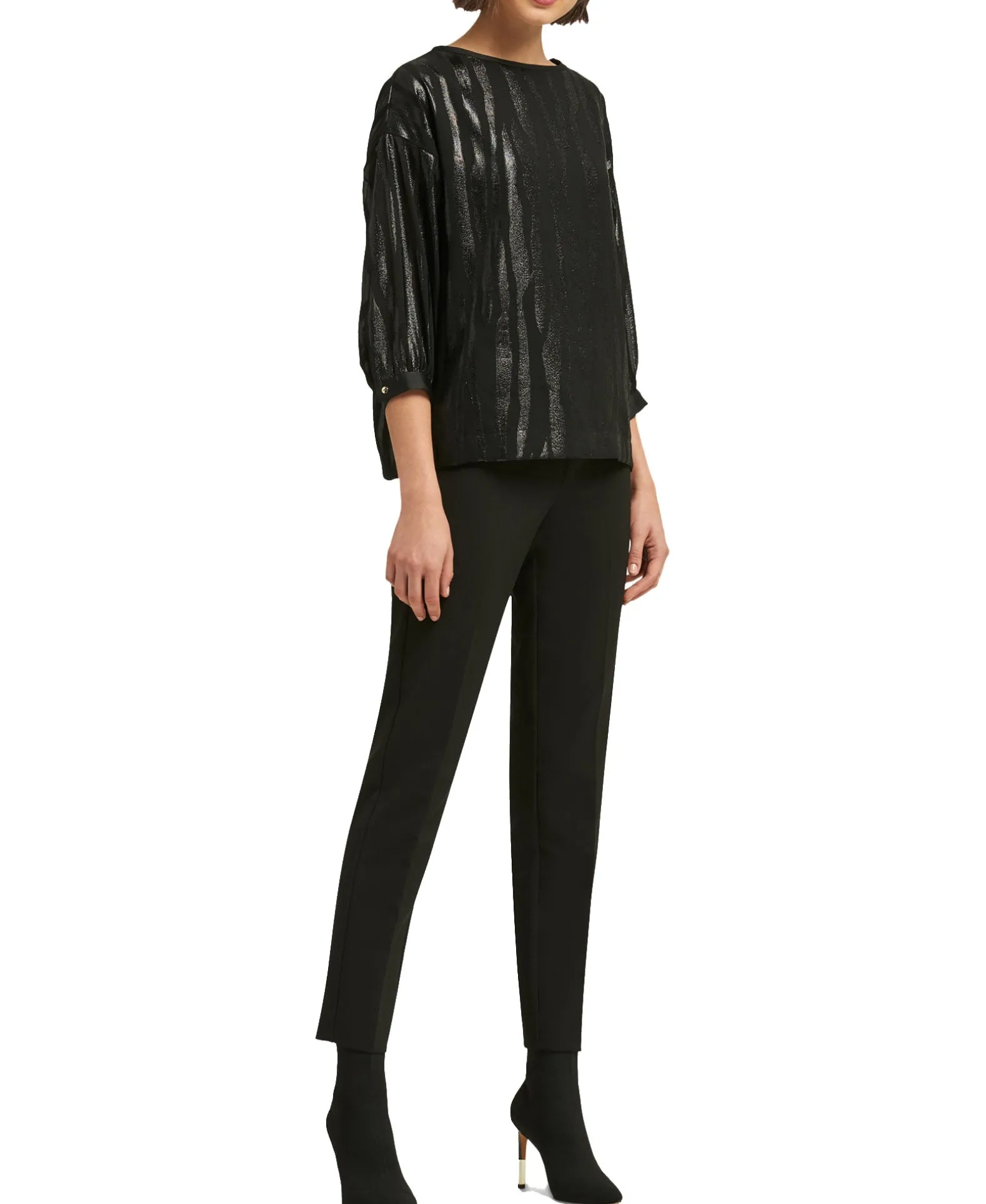 Keeping You Comfortable And Effortless, This Petite DKNY Top Features A 3/4-Sleeve Silhouette And Is Finished With A Cool, Metallic Pattern.