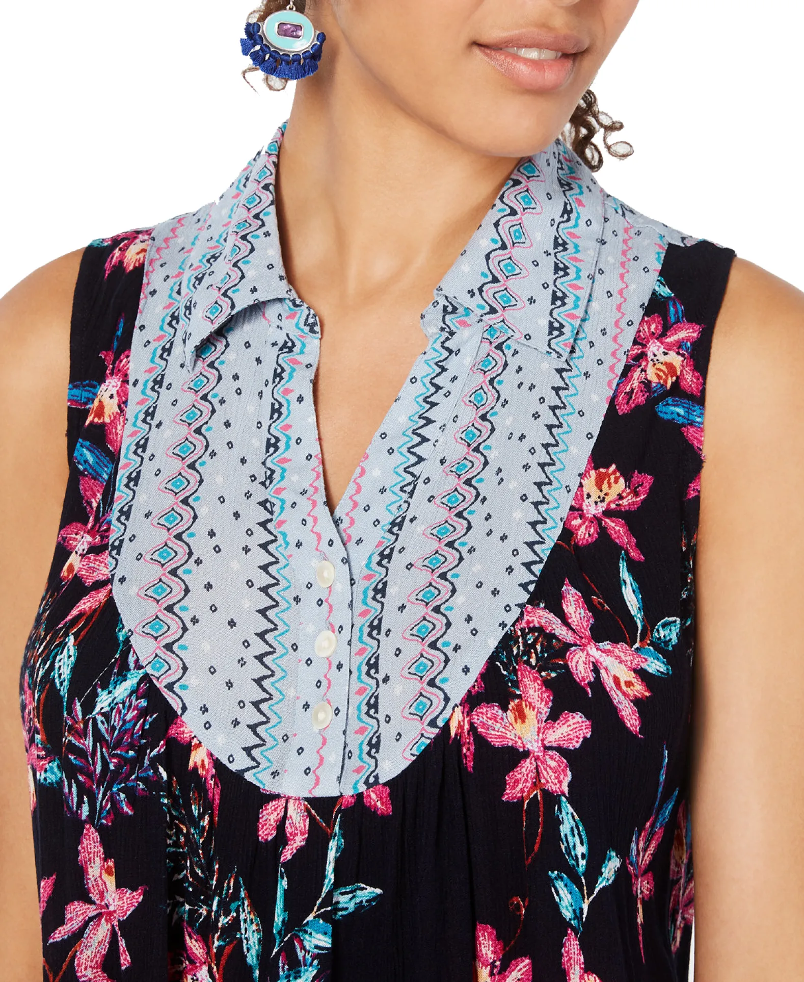 A tailored collar and vibrant prints combine to create an intriguing silhouette for this sleeveless top from Style & Co.