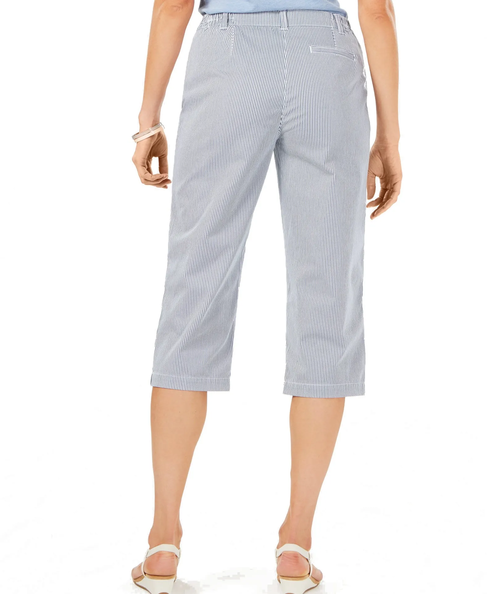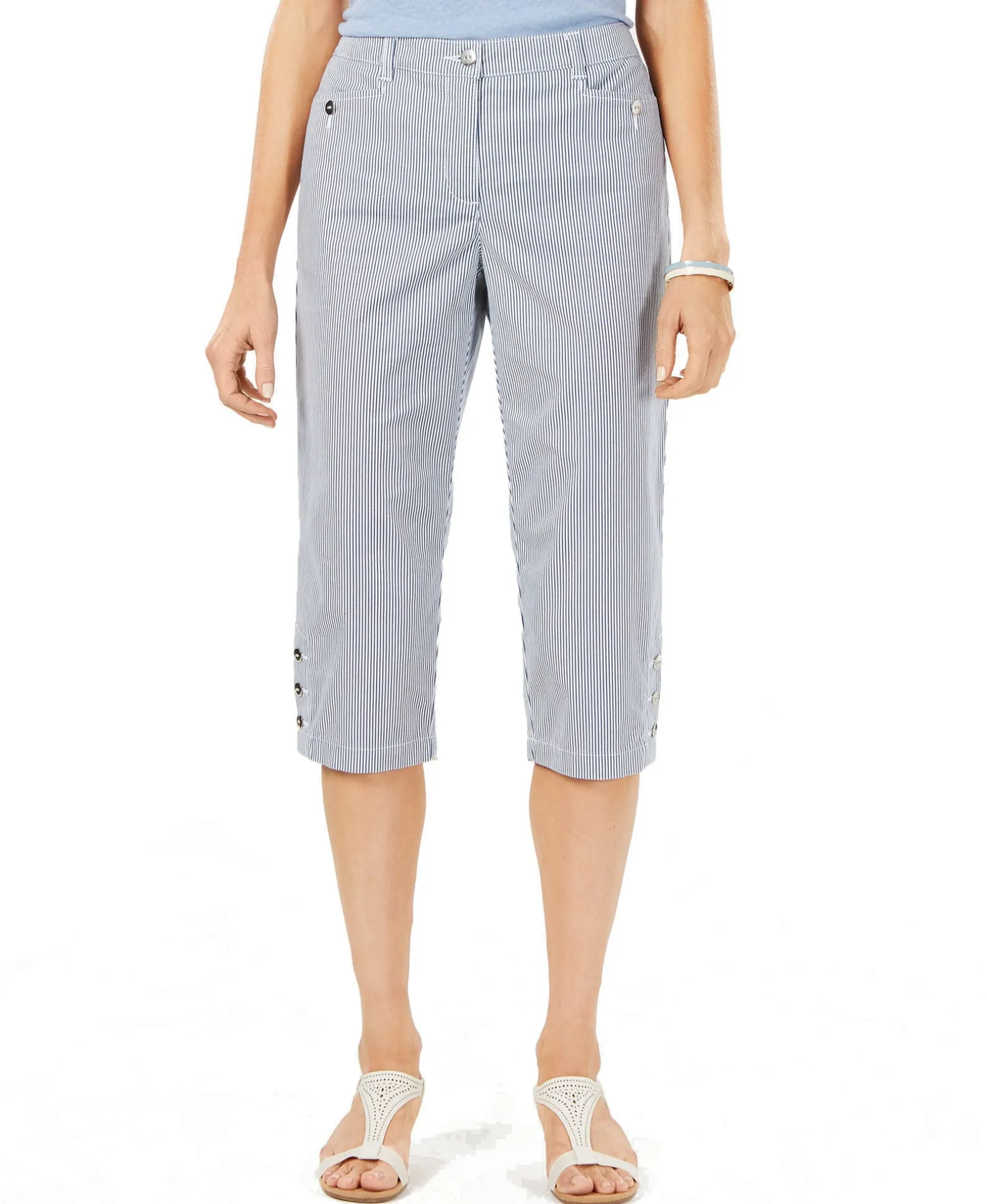 Add Dimension To Your Wardrobe With Karen Scott’s Striped Linen Capri Pants. The Triple-Button Hem Closes Out These Pants In Style.